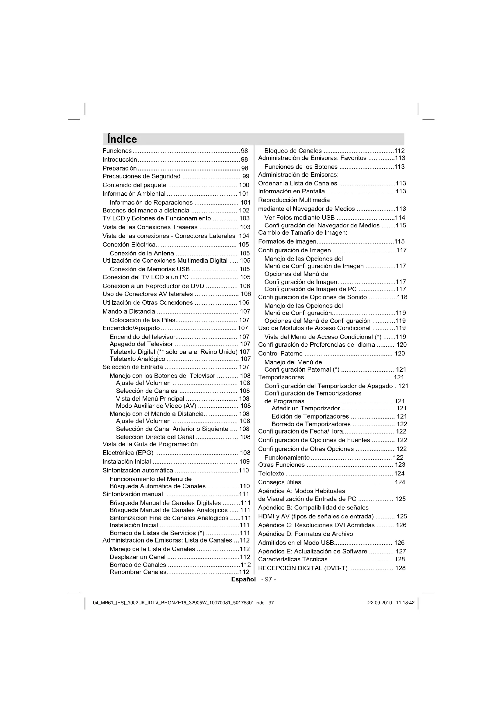 - -MPEG-1 layer I/II, MPEG-2 layer II, AAC, HEAAC, • AC3, E-AC3 -Unterstützte Abtastfrequenzen 32, 44,1 und 48 • kHz 03_MB61_[DE]_3902UK_IDTV_BRONZE16_32905W_10070081_50176301.indd 9603_MB61_[DE]_3902UK_IDTV_BRONZE16_32905W_10070081_50176301.indd 96 22.09.2010 11:16:4122.09.2010 11:16:41Español - 97 - Índice Funciones p. 98