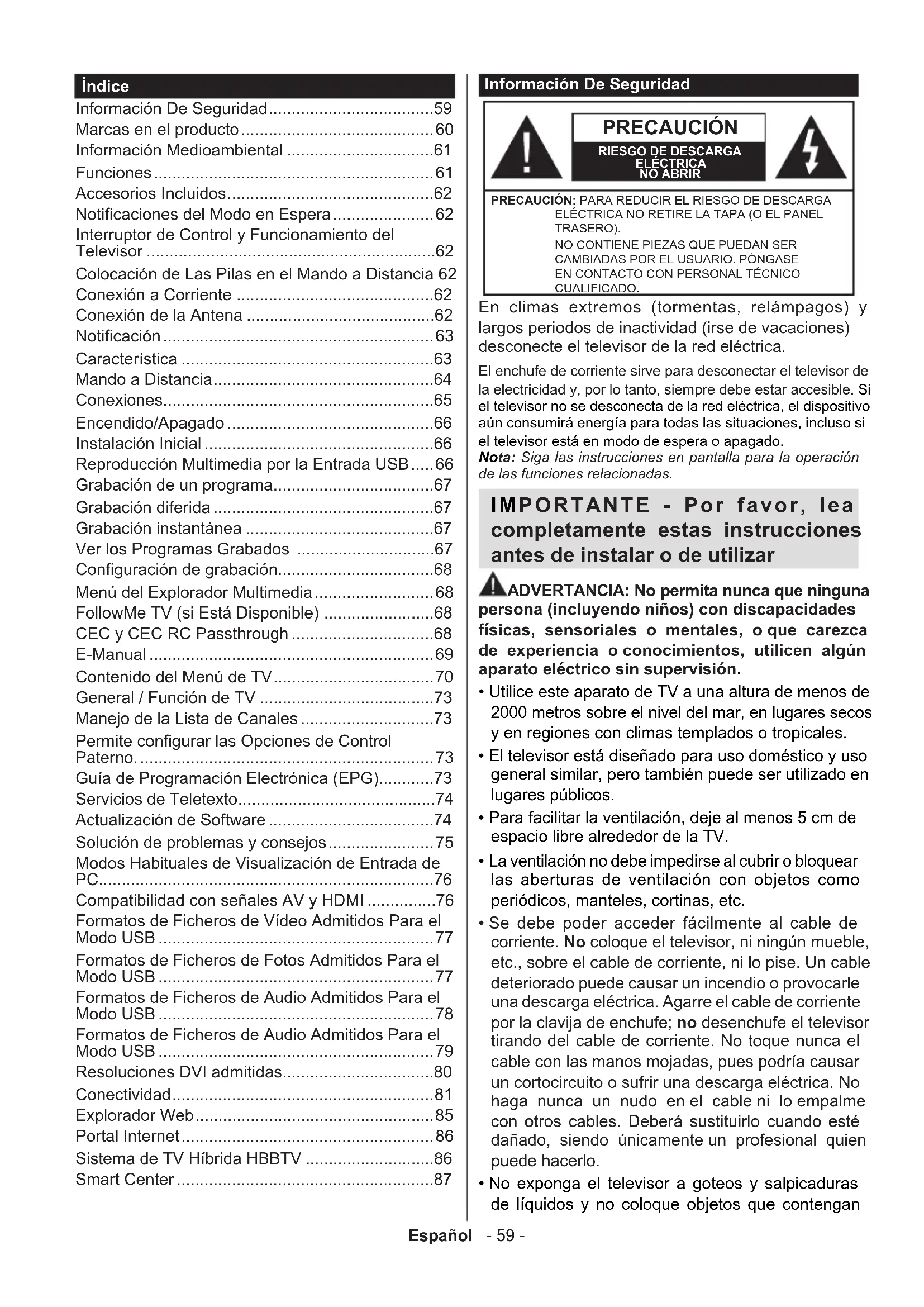 ELÉCTRICA NO ABRIR PRECAUCIÓN: PARA REDUCIR EL RIESGO DE DESCARGA ELÉCTRICA NO RETIRE LA TAPA (O EL PANEL TRASERO). NO CONTIENE PIEZAS QUE PUEDAN SER CAMBIADAS POR EL USUARIO. PÓNGASE EN CONTACTO CON PERSONAL TÉCNICO CUALIFICADO. Nota: Siga las instrucciones en pantalla para la operación de las funciones relacionadas. En climas extremos (tormentas, relámpagos) y largos periodos de inactividad (irse de vacaciones) desconecte el televisor de la red eléctrica. El enchufe de corriente sirve para desconectar el televisor de la electricidad y, por lo tanto, siempre debe estar accesible. Si el televisor no se desconecta de la red eléctrica, el dispositivo aún consumirá energía para todas las situaciones, incluso si el televisor está en modo de espera o apagado. IMPORTANTE - Por favor, lea completamente estas instrucciones antes de instalar o de utilizar ADVERTANCIA: No permita nunca que ninguna persona (incluyendo niños) con discapacidades físicas, sensoriales o mentales, o que carezca de experiencia o conocimientos, utilicen algún aparato eléctrico sin supervisión.