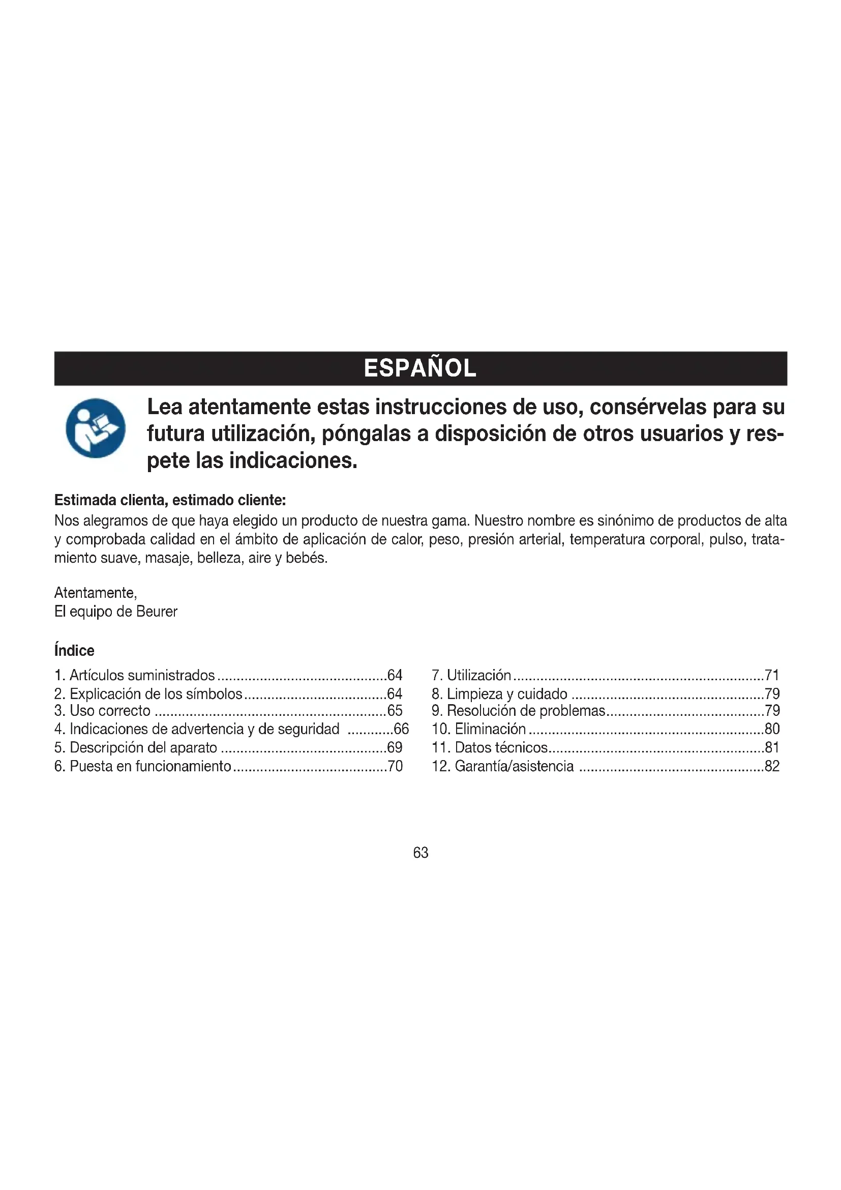 pete las indicaciones. Estimada clienta, estimado cliente: Nos alegramos de que haya elegido un producto de nuestra gama. Nuestro nombre es sinónimo de productos de alta y comprobada calidad en el ámbito de aplicación de calor, peso, presión arterial, temperatura corporal, pulso, trata- miento suave, masaje, belleza, aire y bebés. Atentamente, El equipo de Beurer64