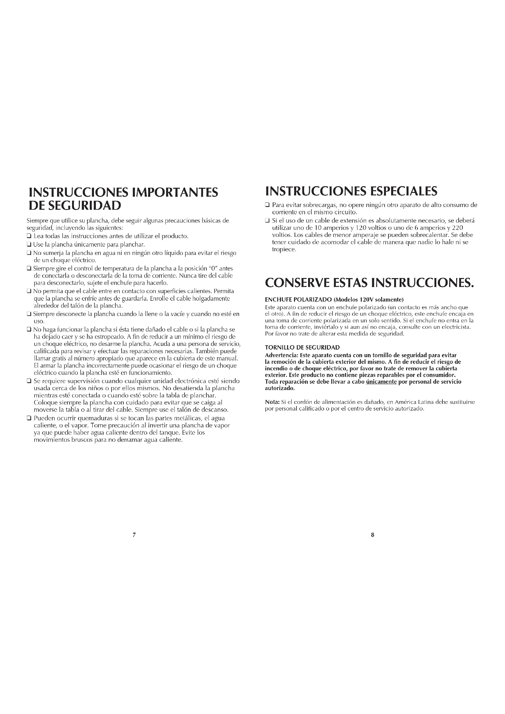 Pueden ocurrir quemaduras si se tocan las partes metálicas, el agua caliente, o el vapor. Tome precaución al invertir una plancha de vapor ya que puede haber agua caliente dentro del tanque. Evite los movimientos bruscos para no derramar agua caliente. CONSERVE ESTAS INSTRUCCIONES. ENCHUFE POLARIZADO (Modelos 120V solamente) Este aparato cuenta con un enchufe polarizado (un contacto es más ancho que el otro). A fin de reducir el riesgo de un choque eléctrico, este enchufe encaja en una toma de corriente polarizada en un solo sentido. Si el enchufe no entra en la toma de corriente, inviértalo y si aun así no encaja, consulte con un electricista. Por favor no trate de alterar esta medida de seguridad.