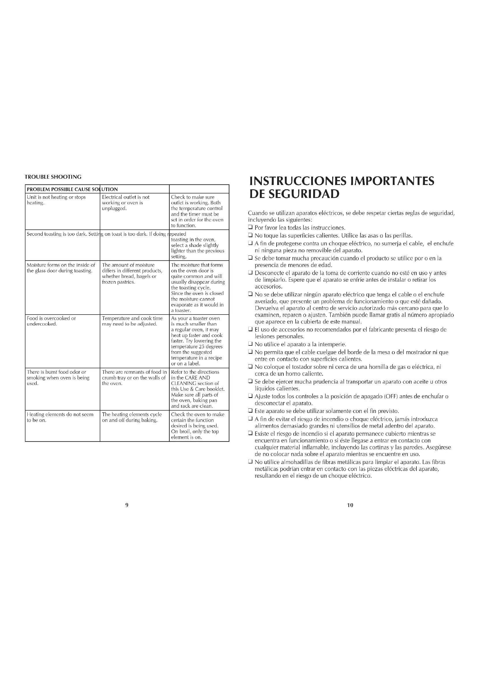 El aparato no calienta o deja de calentar. La toma de corriente no funciona o el horno está desconectado. Verique que la toma de corriente esté funcionando. Tanto el control de temperatura como el cronómetro deben ser ajustados para que el horno funcione. La segunda tanda de tostado resulta muy oscura. El control del grado de tostado está a un nivel demasiado alto. Si repite varias tandas, escoja un grado de tostado más bajo que el anterior. Se forma humedad por dentro en la puerta de vidrio durante el ciclo de tostado. La cantidad de humedad varía entre un producto y otro según los productos; pan, bagels, pasteles etc. La humedad que se forma por dentro en la puerta del horno es bastante común y generalmente desaparece durante el ciclo de tostado. Como la puerta permanece cerrada, la humedad no se puede evaporar como en un tostador normal. Los alimentos se sobre cocinan o no se cocinan bien. La temperatura y el tiempo de cocción pueden requerir reajuste. Como un horno tostador es mucho más pequeño que un horno regular, puede que se caliente y cocine más rápido. Ensaye, reduciendo 25 grados de la temperatura indicada en la receta o en el paquete. El aparato despide olor a comida quemada o humea cuando está en funcionamiento. Hay residuos de comida en la bandeja de recolección o en las paredes del horno. Consulte las instrucciones en la sección de CUIDADO Y LIMPIEZA de este manual. Asegúrese de que todas las partes del horno, bandeja de hornear y parrilla estén limpias. Los elementos calefactores parecen no estar encendidos. Los elementos calefactores funcionan intermitentemente durante el ciclo de cocción. Asegúrese que el aparato esté ajustado a la función correcta. Para el caso, cuando uno asa los alimentos, solamente se enciende el elemento calefactor superior.