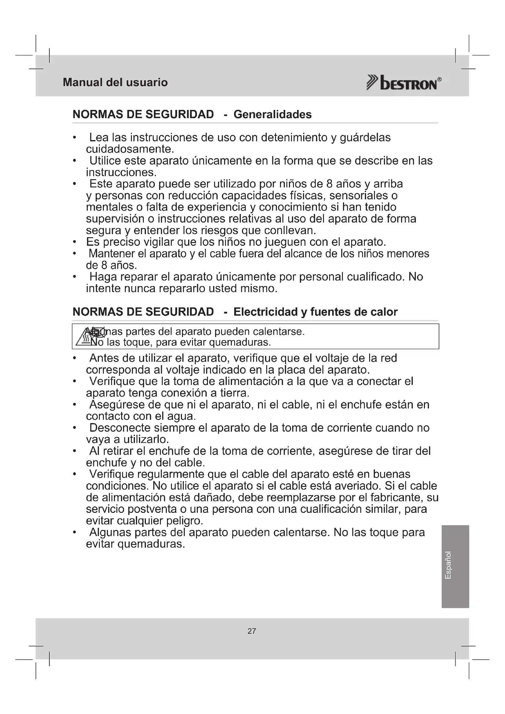 - Procure que ni el aparato, ni el cable, ni el enchufe estén en contacto con fuentes de calor, por ejemplo, con una placa caliente de la cocina o una llama. NORMAS DE SEGURIDAD - Uso