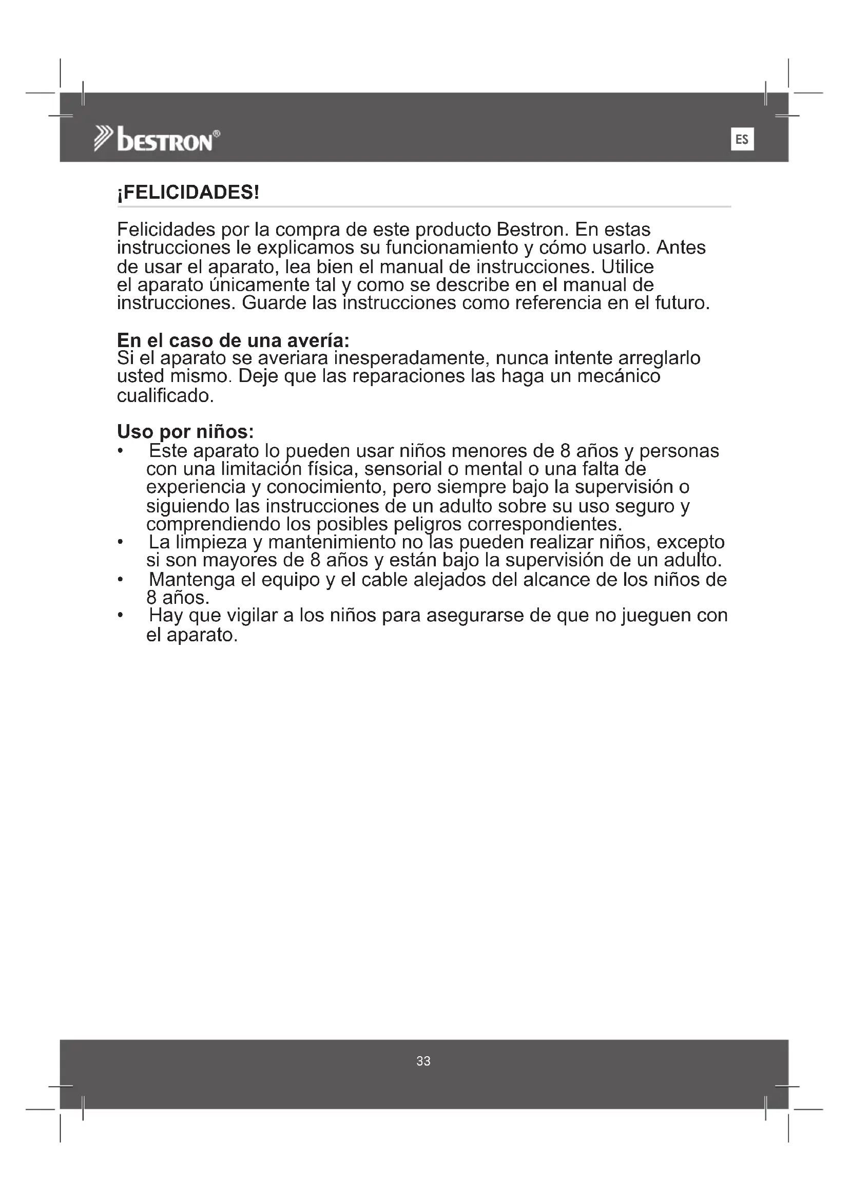 ¡FELICIDADES! Felicidades por la compra de este producto Bestron. En estas instruccionesleexplicamossufuncionamientoycómousarlo.Antes de usar el aparato, lea bien el manual de instrucciones. Utilice el aparato únicamente tal y como se describe en el manual de instrucciones. Guarde las instrucciones como referencia en el futuro. En el caso de una avería: Si el aparato se averiara inesperadamente, nunca intente arreglarlo usted mismo. Deje que las reparaciones las haga un mecánico cualificado. Uso por niños: