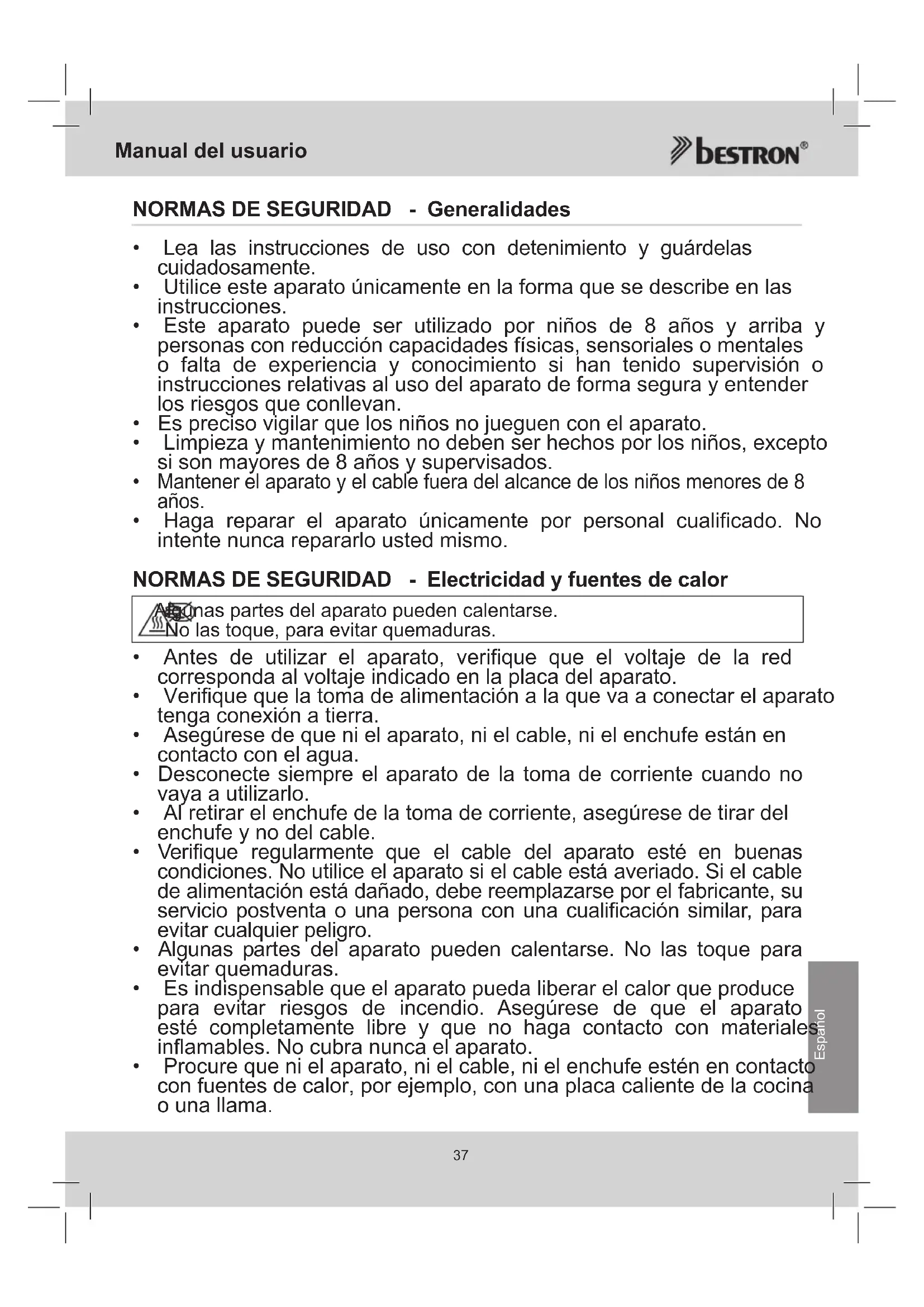 - Haga reparar el aparato únicamente por personal cualificado. No intente nunca repararlo usted mismo. NORMAS DE SEGURIDAD - Electricidad y fuentes de calor Algunas partes del aparato pueden calentarse. No las toque, para evitar quemaduras.