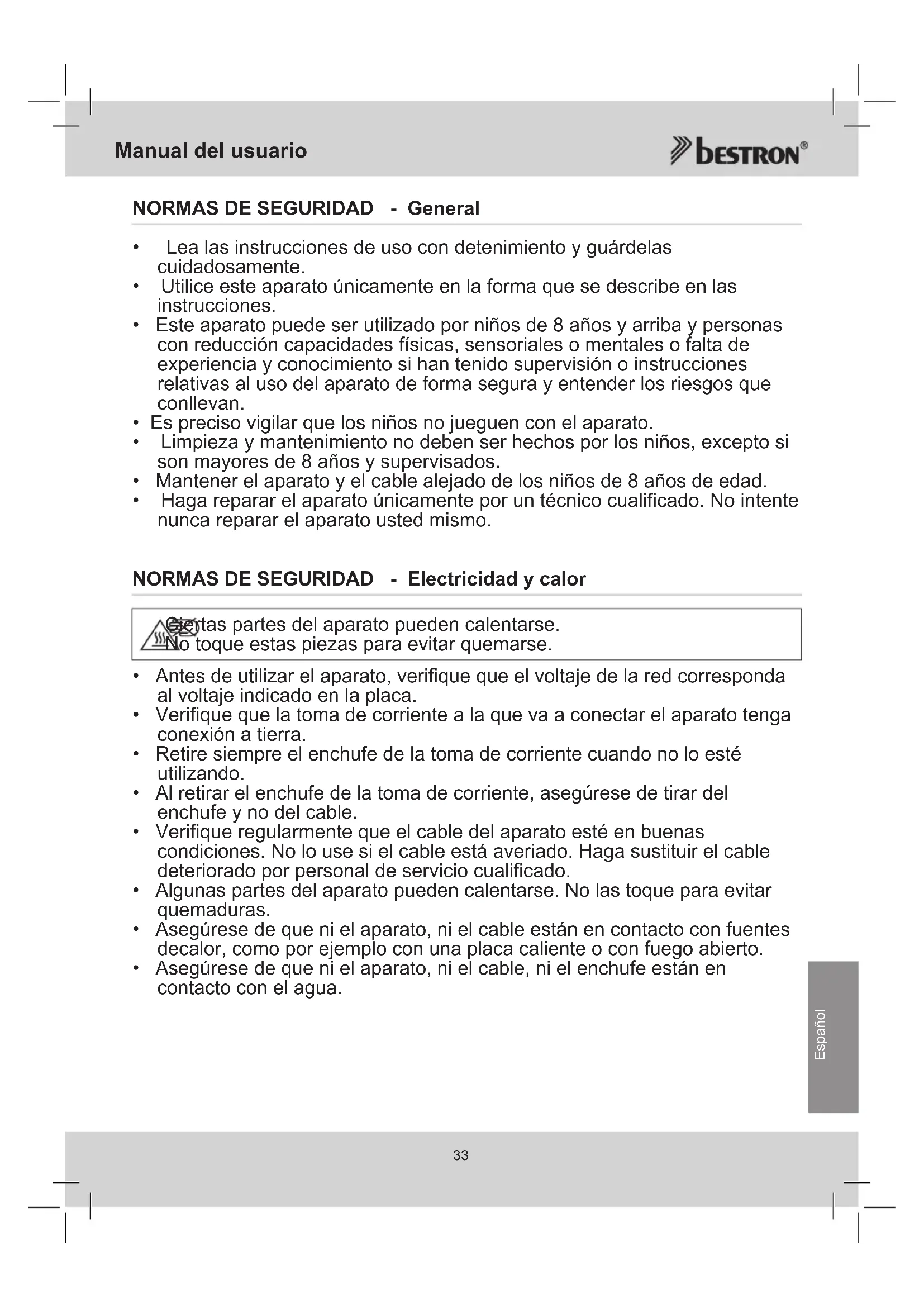 SERVICIO Si se presenta un fallo inesperado, puede ponerse en contacto con el departamento de servicios de BESTRON: www.bestron.com/serviceManual del usuario