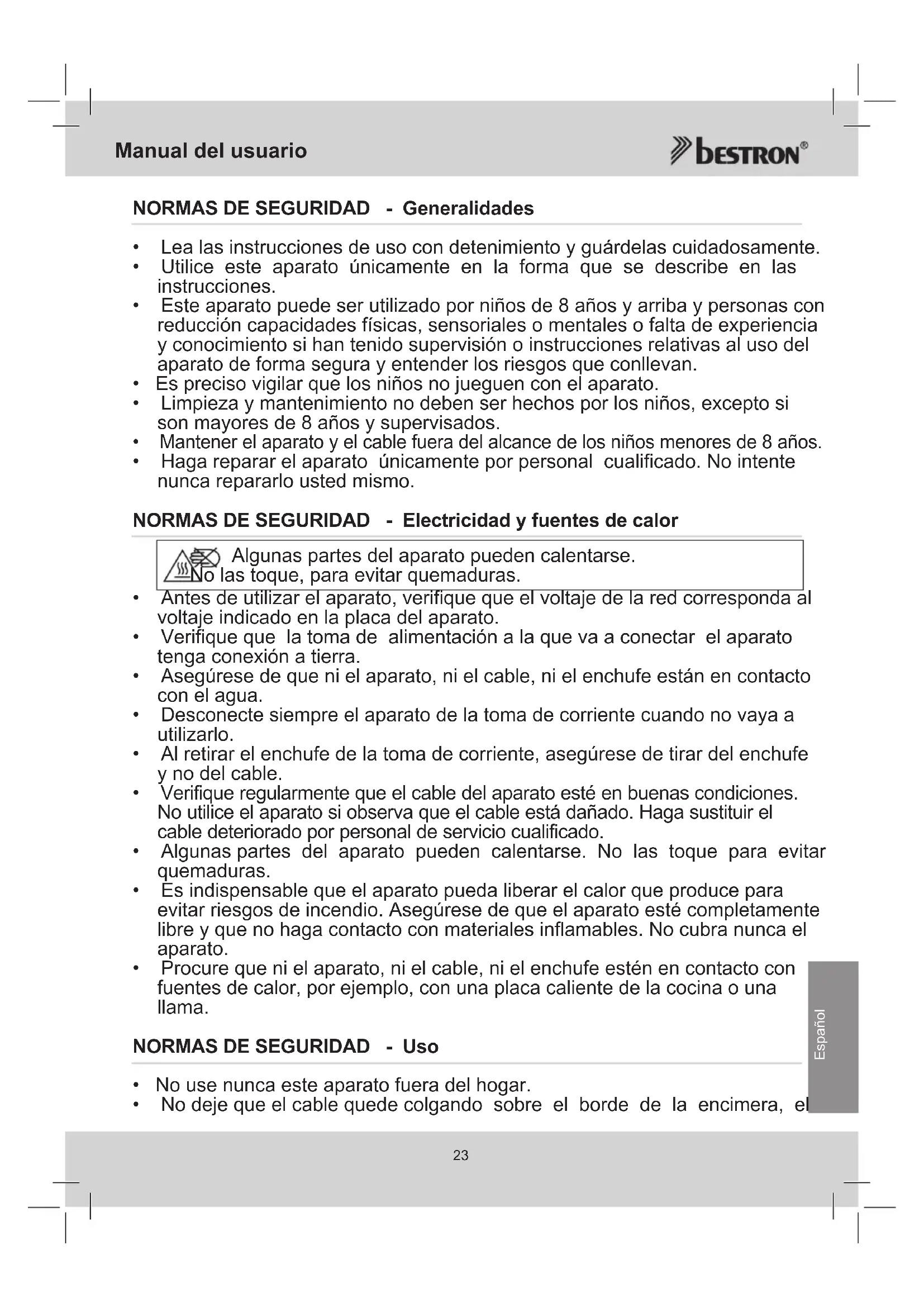 - Procure que ni el aparato, ni el cable, ni el enchufe estén en contacto con fuentes de calor, por ejemplo, con una placa caliente de la cocina o una llama. NORMAS DE SEGURIDAD - Uso