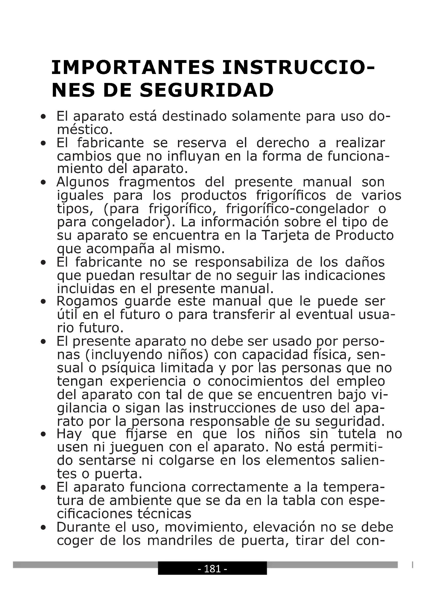- Algunos fragmentos del presente manual son iguales para los productos frigorícos de varios tipos, (para frigoríco, frigoríco-congelador o para congelador). La información sobre el tipo de su aparato se encuentra en la Tarjeta de Producto que acompaña al mismo.