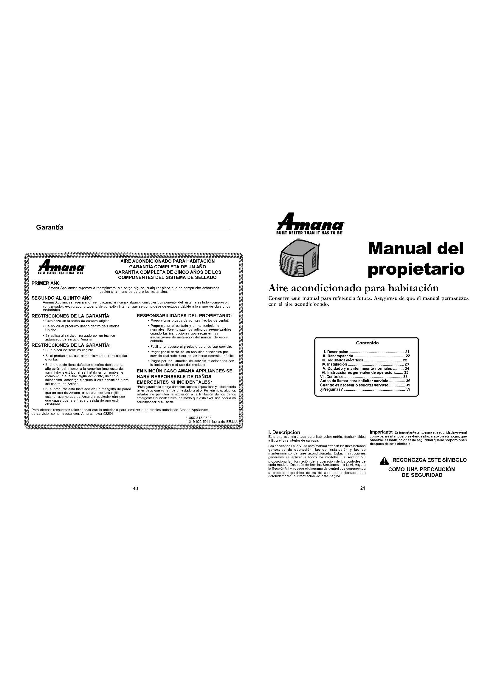 llame al Departamento de asuntos del cliente al 1-800-843-0304 Amana se complace en ofrecer protección de servicio a largoplazo para este nuevo aire acondicionado para habitación. ElPlan de servicio extendido Asure está diseñadoespecialmente para complementar la excelente garantía deAmana. Asure proporciona una cobertura económica parael aire acondicionado para habitación por hasta cinco añoscompletos e incluye piezas, mano de obra y gastos detransportación.Los distribuidores de Amana participantes tienen lainformación o comuníquese a:Amana AppliancesAmana, IA 522041-800-528-2682 LÍNEA DE INFORMACIÓN DEL CONSUMIDOR gratuita de Amana al 1-800-843-0304 (No es una línea de apoyo técnicopara los distribuidores.)Plan de servicio extendido Asure TM38