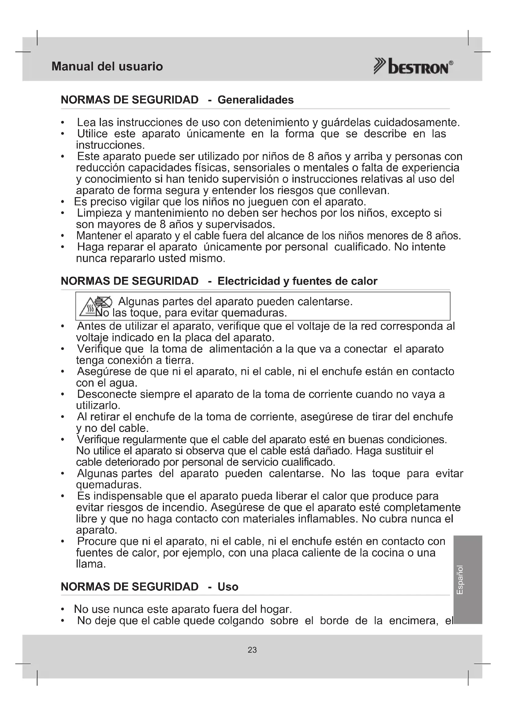 - Procure que ni el aparato, ni el cable, ni el enchufe estén en contacto con fuentes de calor, por ejemplo, con una placa caliente de la cocina o una llama. NORMAS DE SEGURIDAD - Uso