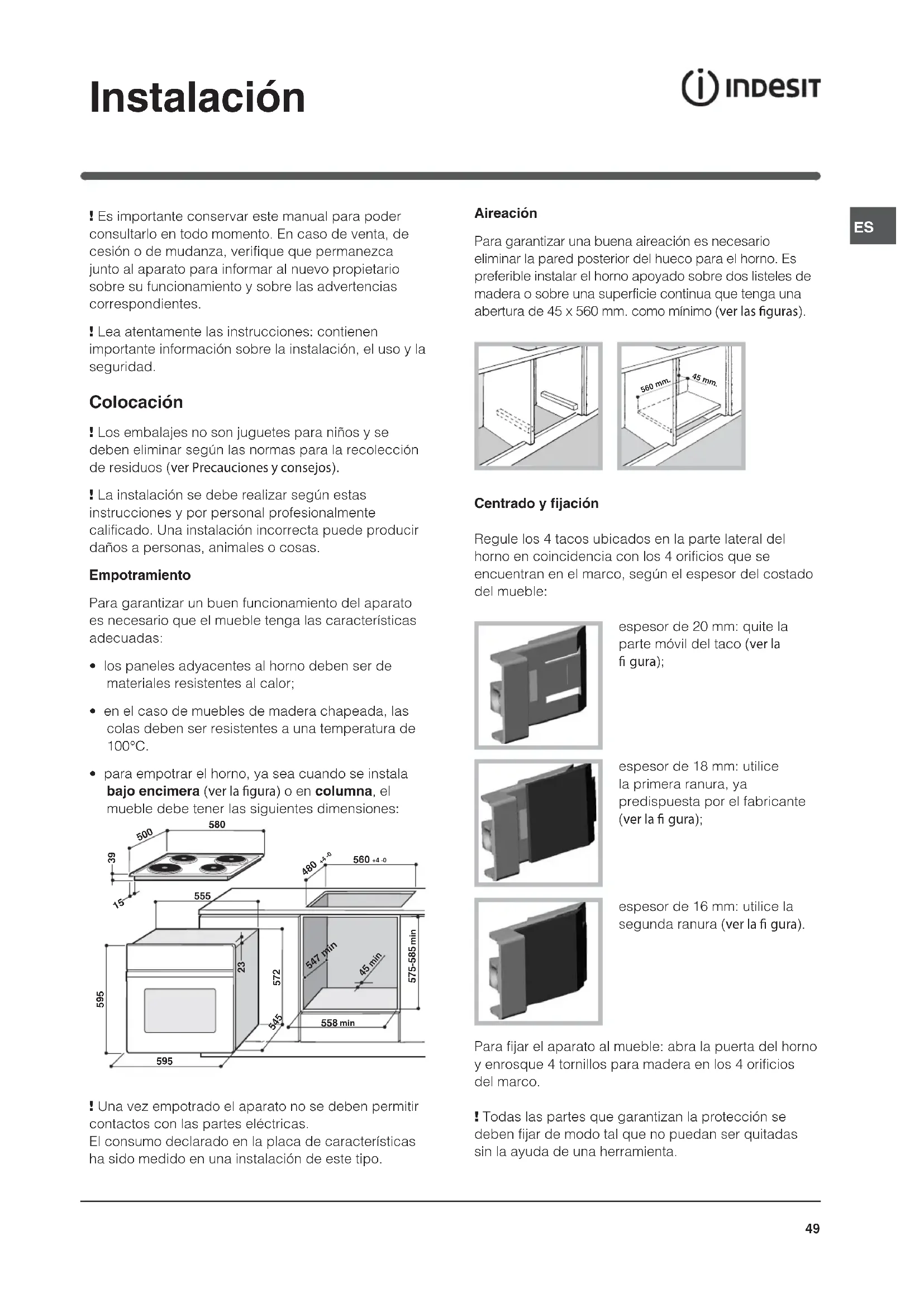 - para empotrar el horno, ya sea cuando se instala bajo encimera (ver la gura) o en columna, el mueble debe tener las siguientes dimensiones: ! Una vez empotrado el aparato no se deben permitir contactos con las partes eléctricas. El consumo declarado en la placa de características ha sido medido en una instalación de este tipo. Aireación Para garantizar una buena aireación es necesario eliminar la pared posterior del hueco para el horno. Es preferible instalar el horno apoyado sobre dos listeles de madera o sobre una superficie continua que tenga una abertura de 45 x 560 mm. como mínimo (ver las guras). Centrado y fijación Regule los 4 tacos ubicados en la parte lateral del horno en coincidencia con los 4 orificios que se encuentran en el marco, según el espesor del costado del mueble: espesor de 20 mm: quite la parte móvil del taco (ver la gura); espesor de 18 mm: utilice la primera ranura, ya predispuesta por el fabricante (ver la gura); espesor de 16 mm: utilice la segunda ranura (ver la gura). Para fijar el aparato al mueble: abra la puerta del horno y enrosque 4 tornillos para madera en los 4 orificios del marco. ! Todas las partes que garantizan la protección se deben fijar de modo tal que no puedan ser quitadas sin la ayuda de una herramienta.