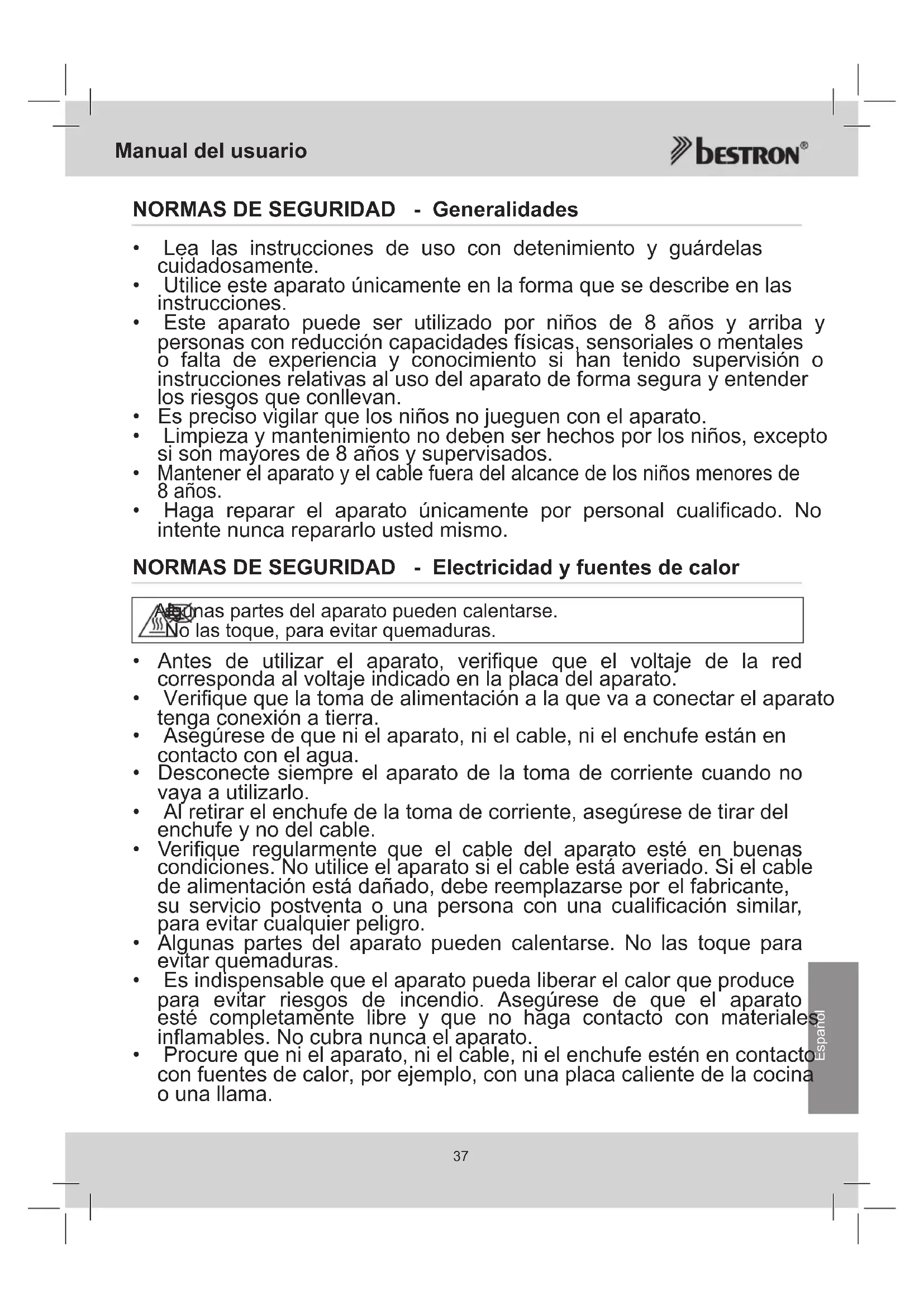SERVICIO Si se presenta un fallo inesperado, puede ponerse en contacto con el departamento de servicios de BESTRON: www.bestron.com/service CERTIFICACIÓN DE CONFORMIDAD (CE) Este producto satisface las disposiciones de las siguientes directivas de la Unión Europea en el marco de la seguridad: