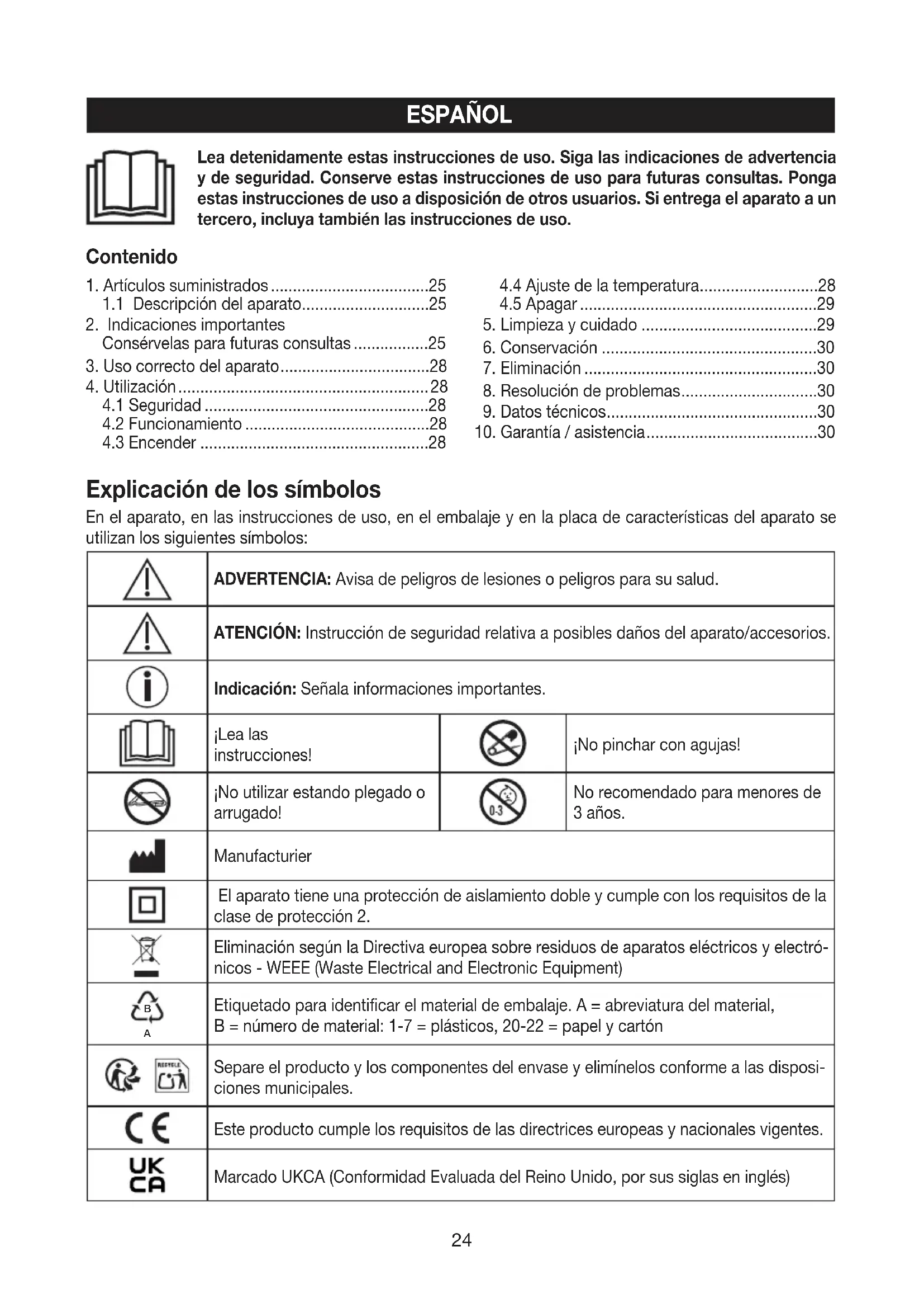 Pour plus d’informations sur la garantie et les conditions de garantie, consultez la fiche de garantie fournie. Sous réserve d’erreurs et de modifications24 Explicación de los símbolos En el aparato, en las instrucciones de uso, en el embalaje y en la placa de características del aparato se utilizan los siguientes símbolos: ADVERTENCIA: Avisa de peligros de lesiones o peligros para su salud. ATENCIÓN: Instrucción de seguridad relativa a posibles daños del aparato/accesorios. Indicación: Señala informaciones importantes. ¡Lea las instrucciones! ¡No pinchar con agujas! ¡No utilizar estando plegado o arrugado! No recomendado para menores de 3 años. Manufacturier El aparato tiene una protección de aislamiento doble y cumple con los requisitos de la clase de protección 2. Eliminación según la Directiva europea sobre residuos de aparatos eléctricos y electró- nicos - WEEE (Waste Electrical and Electronic Equipment)