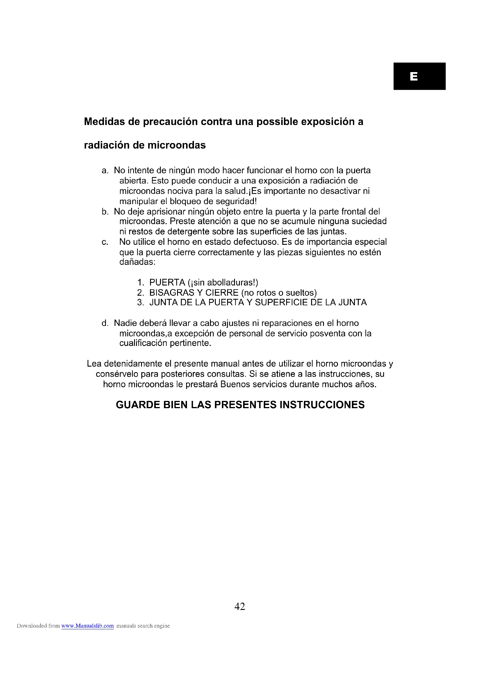 Downloaded from www.Manualslib.com manuals search engineMedidas de precaución contra una possible exposición a radiación de microondas a. No intente de ningún modo hacer funcionar el horno con la puerta abierta. Esto puede conducir a una exposición a radiación de microondas nociva para la salud.¡Es importante no desactivar ni manipular el bloqueo de seguridad! b. No deje aprisionar ningún objeto entre la puerta y la parte frontal del microondas. Preste atención a que no se acumule ninguna suciedad ni restos de detergente sobre las superficies de las juntas. c. No utilice el horno en estado defectuoso. Es de importancia especial que la puerta cierre correctamente y las piezas siguientes no estén dañadas: