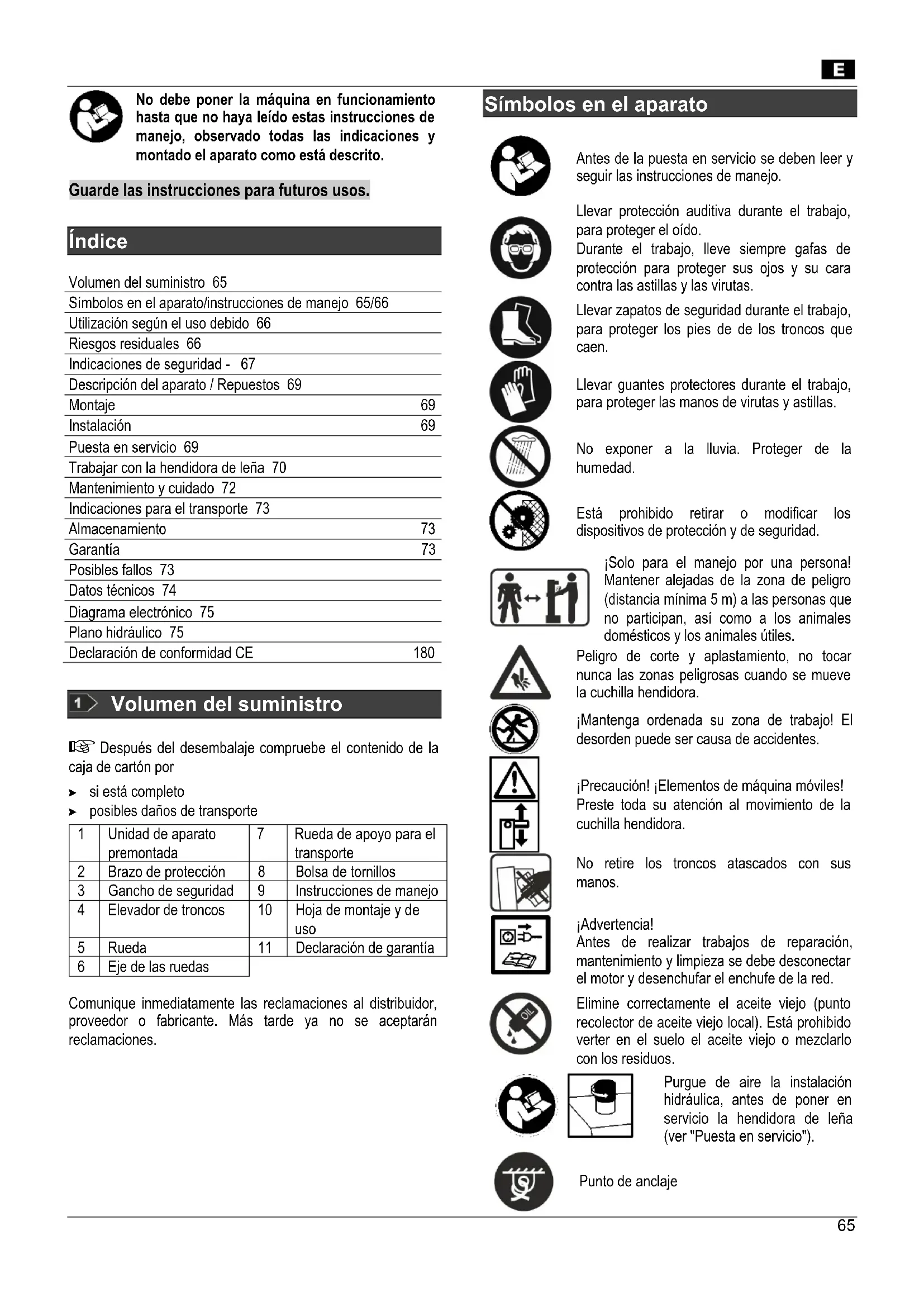 Índice Volumen del suministro 65 Símbolos en el aparato/instrucciones de manejo 65/66 Utilización según el uso debido 66 Riesgos residuales 66 Indicaciones de seguridad - 67 Descripción del aparato / Repuestos 69 Montaje 69 Instalación 69 Puesta en servicio 69 Trabajar con la hendidora de leña 70 Mantenimiento y cuidado 72 Indicaciones para el transporte 73 Almacenamiento 73 Garantía 73 Posibles fallos 73 Datos técnicos 74 Diagrama electrónico 75 Plano hidráulico 75 Declaración de conformidad CE 180