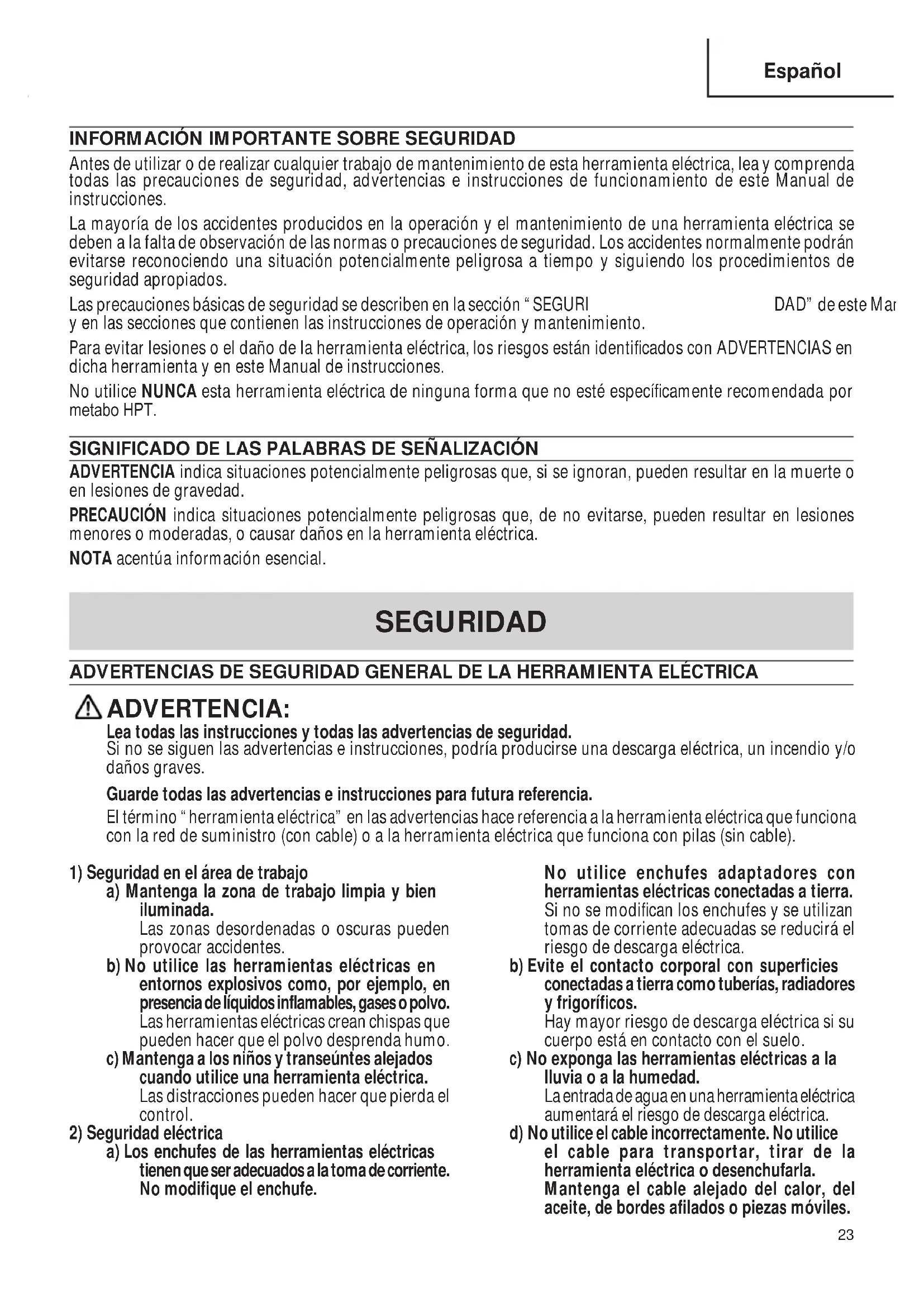 Antes de utilizar o de realizar cualquier trabajo de mantenimiento de esta herramienta eléctrica, lea y comprenda todas las precauciones de seguridad, advertencias e instrucciones de funcionamiento de este Manual de instrucciones. La mayoría de los accidentes producidos en la operación y el mantenimiento de una herramienta eléctrica se deben a la falta de observación de las normas o precauciones de seguridad. Los accidentes normalmente podrán evitarse reconociendo una situación potencialmente peligrosa a tiempo y siguiendo los procedimientos de seguridad apropiados. Las precauciones básicas de seguridad se describen en la sección “SEGURI DAD” de este Manual de instrucciones y en las secciones que contienen las instrucciones de operación y mantenimiento. Para evitar lesiones o el daño de la herramienta eléctrica, los riesgos están identificados con ADVERTENCIAS en dicha herramienta y en este Manual de instrucciones. No utilice NUNCA esta herramienta eléctrica de ninguna forma que no esté específicamente recomendada por metabo HPT. SIGNIFICADO DE LAS PALABRAS DE SEÑALIZACIÓN ADVERTENCIA indica situaciones potencialmente peligrosas que, si se ignoran, pueden resultar en la muerte o en lesiones de gravedad. PRECAUCIÓN indica situaciones potencialmente peligrosas que, de no evitarse, pueden resultar en lesiones menores o moderadas, o causar daños en la herramienta eléctrica. NOTA acentúa información esencial. SEGURIDAD ADVERTENCIAS DE SEGURIDAD GENERAL DE LA HERRAMIENTA ELÉCTRICA ADVERTENCIA: Lea todas las instrucciones y todas las advertencias de seguridad. Si no se siguen las advertencias e instrucciones, podría producirse una descarga eléctrica, un incendio y/o daños graves. Guarde todas las advertencias e instrucciones para futura referencia. El término “herramienta eléctrica” en las advertencias hace referencia a la herramienta eléctrica que funciona con la red de suministro (con cable) o a la herramienta eléctrica que funciona con pilas (sin cable).
