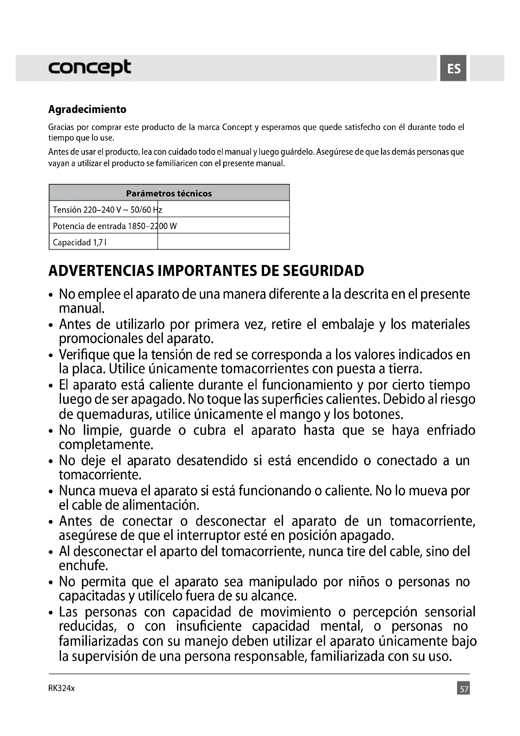 Agradecimiento Gracias por comprar este producto de la marca Concept y esperamos que quede satisfecho con él durante todo el tiempo que lo use. Antes de usar el producto, lea con cuidado todo el manual y luego guárdelo. Asegúrese de que las demás personas que vayan a utilizar el producto se familiaricen con el presente manual. Parámetros técnicos Tensión 220–240 V ~ 50/60 Hz Potencia de entrada 1850–2200 W Capacidad 1,7 l