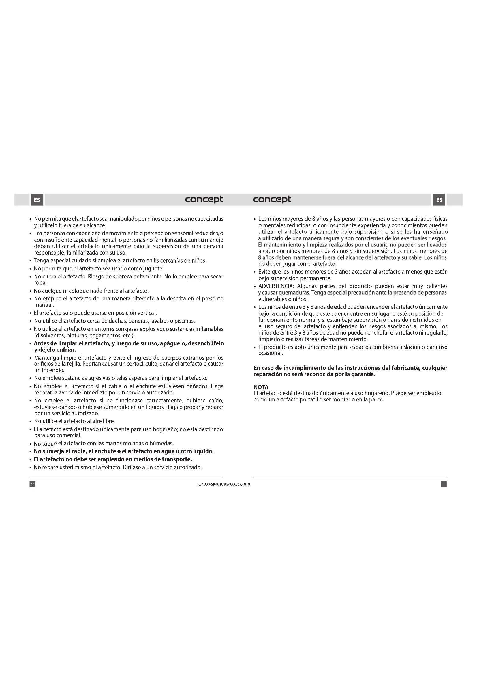 - El producto es apto únicamente para espacios con buena aislación o para uso ocasional. En caso de incumplimiento de las instrucciones del fabricante, cualquier reparación no será reconocida por la garantía. NOTA El artefacto está destinado únicamente a uso hogareño. Puede ser empleado como un artefacto portátil o ser montado en la pared.96 97 KS4000/SK4010 KS4000/SK4010 ESES