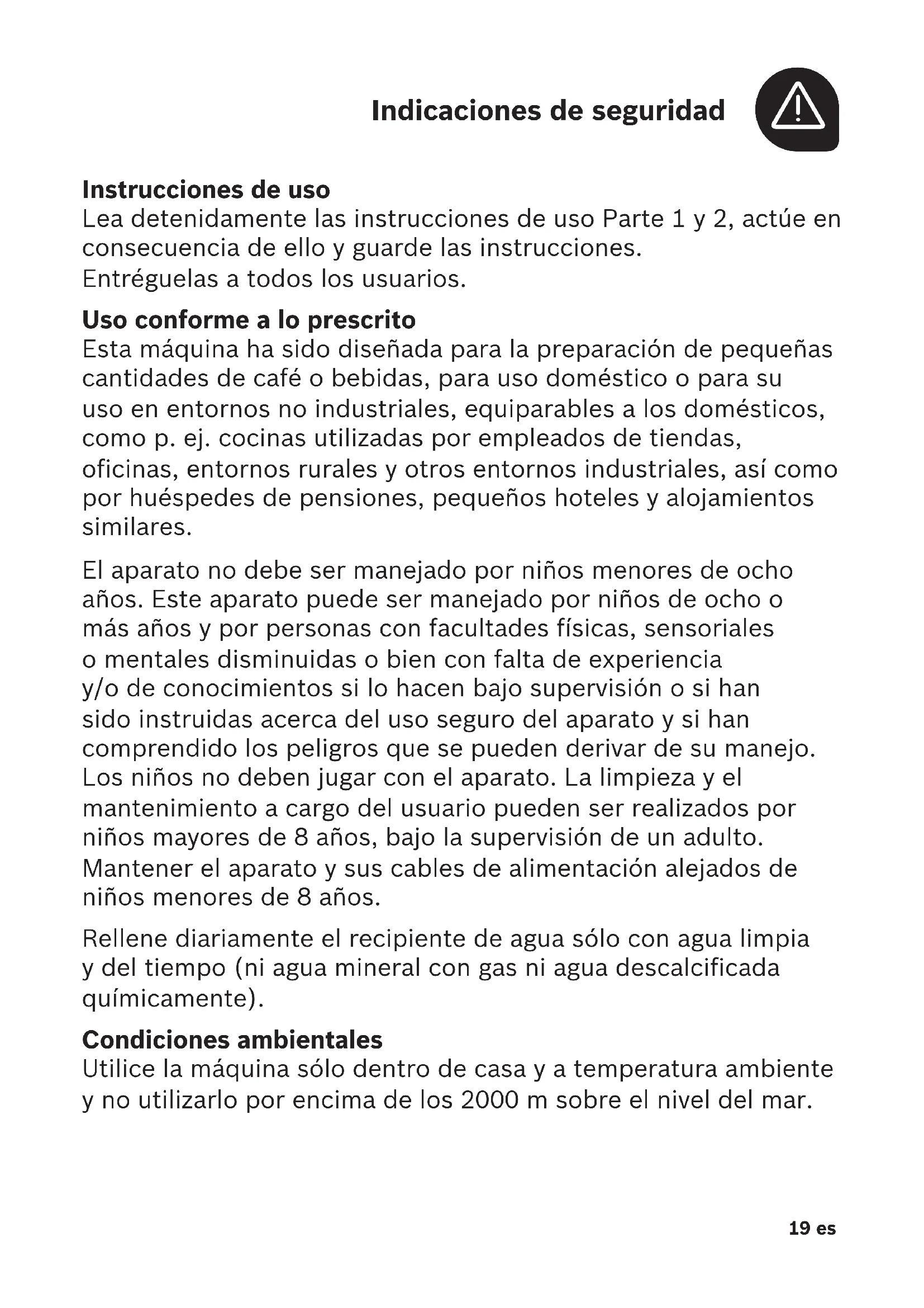 Instrucciones de uso Lea detenidamente las instrucciones de uso Parte1 y 2, actúe en consecuencia de ello y guarde las instrucciones. Entréguelas a todos los usuarios. Uso conforme a lo prescrito Esta máquina ha sido diseñada para la preparación de pequeñas cantidades de café o bebidas, para uso doméstico o para su uso en entornos no industriales, equiparables a los domésticos, como p. ej. cocinas utilizadas por empleados de tiendas, oficinas, entornos rurales y otros entornos industriales, así como por huéspedes de pensiones, pequeños hoteles y alojamientos similares. El aparato no debe ser manejado por niños menores de ocho años. Este aparato puede ser manejado por niños de ocho o más años y por personas con facultades físicas, sensoriales o mentales disminuidas o bien con falta de experiencia y/o de conocimientos si lo hacen bajo supervisión o si han sido instruidas acerca del uso seguro del aparato y si han comprendido los peligros que se pueden derivar de su manejo. Los niños no deben jugar con el aparato. La limpieza y el mantenimiento a cargo del usuario pueden ser realizados por niños mayores de 8 años, bajo la supervisión de un adulto. Mantener el aparato y sus cables de alimentación alejados de niños menores de 8 años. Rellene diariamente el recipiente de agua sólo con agua limpia y del tiempo (niagua mineral con gas ni agua descalcificada químicamente). Condiciones ambientales Utilice la máquina sólo dentro de casa y a temperatura ambiente y no utilizarlo por encima de los 2000 m sobre el nivel del mar.20es Indicaciones de seguridad