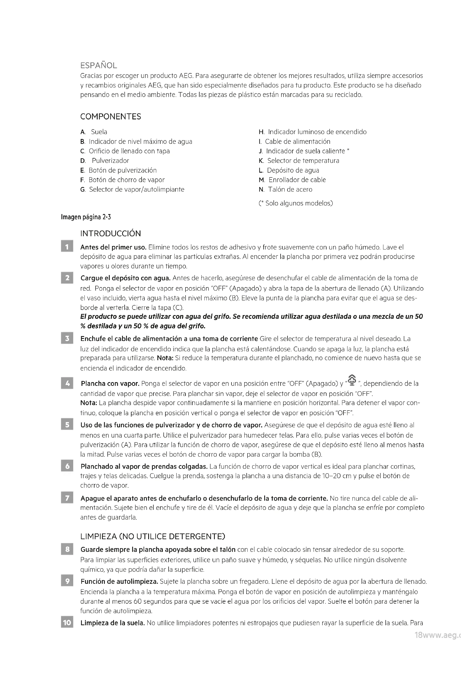 J. Indicador de suela caliente * K. Selector de temperatura L. Depósito de agua M. Enrollador de cable N. Talón de acero (* Solo algunos modelos) Imagen página 2-3 INTRODUCCIÓN 1 Antes del primer uso. Elimine todos los restos de adhesivo y frote suavemente con un paño húmedo. Lave el depósito de agua para eliminar las partículas extrañas. Al encender la plancha por primera vez podrán producirse vapores u olores durante un tiempo. 2 Cargue el depósito con agua. Antes de hacerlo, asegúrese de desenchufar el cable de alimentación de la toma de red. Ponga el selector de vapor en posición “OFF” (Apagado) y abra la tapa de la abertura de llenado (A). Utilizando el vaso incluido, vierta agua hasta el nivel máximo (B). Eleve la punta de la plancha para evitar que el agua se des- borde al verterla. Cierre la tapa (C). El producto se puede utilizar con agua del grifo. Se recomienda utilizar agua destilada o una mezcla de un 50 % destilada y un 50 % de agua del grifo. 3 Enchufe el cable de alimentación a una toma de corriente Gire el selector de temperatura al nivel deseado. La luz del indicador de encendido indica que la plancha está calentándose. Cuando se apaga la luz, la plancha está preparada para utilizarse. Nota: Si reduce la temperatura durante el planchado, no comience de nuevo hasta que se encienda el indicador de encendido. 4 Plancha con vapor. Ponga el selector de vapor en una posición entre “OFF” (Apagado) y “ ”, dependiendo de la cantidad de vapor que precise. Para planchar sin vapor, deje el selector de vapor en posición “OFF”. Nota: La plancha despide vapor continuadamente si la mantiene en posición horizontal. Para detener el vapor con- tinuo, coloque la plancha en posición vertical o ponga el selector de vapor en posición “OFF”. 5 Uso de las funciones de pulverizador y de chorro de vapor. Asegúrese de que el depósito de agua esté lleno al menos en una cuarta parte. Utilice el pulverizador para humedecer telas. Para ello, pulse varias veces el botón de pulverización (A). Para utilizar la función de chorro de vapor, asegúrese de que el depósito esté lleno al menos hasta la mitad. Pulse varias veces el botón de chorro de vapor para cargar la bomba (B). 6 Planchado al vapor de prendas colgadas. La función de chorro de vapor vertical es ideal para planchar cortinas, trajes y telas delicadas. Cuelgue la prenda, sostenga la plancha a una distancia de 10–20 cm y pulse el botón de chorro de vapor. 7 Apague el aparato antes de enchufarlo o desenchufarlo de la toma de corriente. No tire nunca del cable de ali- mentación. Sujete bien el enchufe y tire de él. Vacíe el depósito de agua y deje que la plancha se enfríe por completo antes de guardarla. LIMPIEZA (NO UTILICE DETERGENTE) 8 Guarde siempre la plancha apoyada sobre el talón con el cable colocado sin tensar alrededor de su soporte. Para limpiar las supercies exteriores, utilice un paño suave y húmedo, y séquelas. No utilice ningún disolvente químico, ya que podría dañar la supercie. 9 Función de autolimpieza. Sujete la plancha sobre un fregadero. Llene el depósito de agua por la abertura de llenado. Encienda la plancha a la temperatura máxima. Ponga el botón de vapor en posición de autolimpieza y manténgalo durante al menos 60 segundos para que se vacíe el agua por los oricios del vapor. Suelte el botón para detener la función de autolimpieza. 10 Limpieza de la suela. No utilice limpiadores potentes ni estropajos que pudiesen rayar la supercie de la suela. Para19www.aeg.com