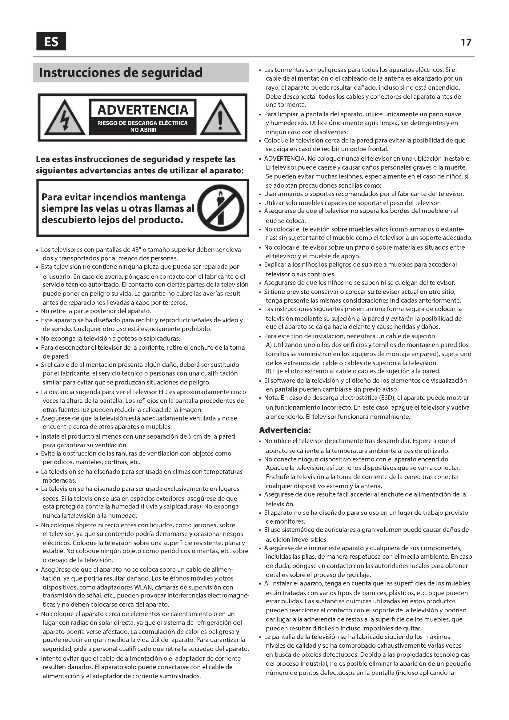Lea estas instrucciones de seguridad y respete las siguientes advertencias antes de utilizar el aparato: Para evitar incendios mantenga siempre las velas u otras llamas al descubierto lejos del producto.