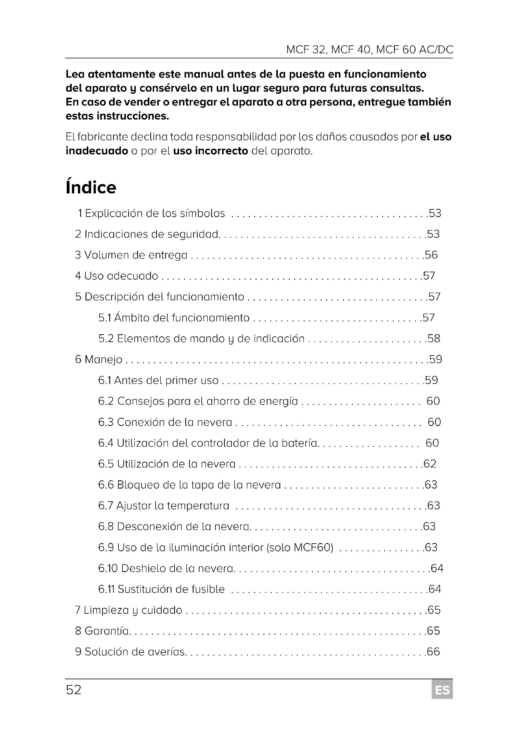 - Lea atentamente este manual antes de la puesta en funcionamiento del aparato y consérvelo en un lugar seguro para futuras consultas. En caso de vender o entregar el aparato a otra persona, entregue también estas instrucciones. El fabricante declina toda responsabilidad por los daños causados por el uso inadecuado o por el uso incorrecto del aparato. Índice 1 Explicación de los símbolos p. 53