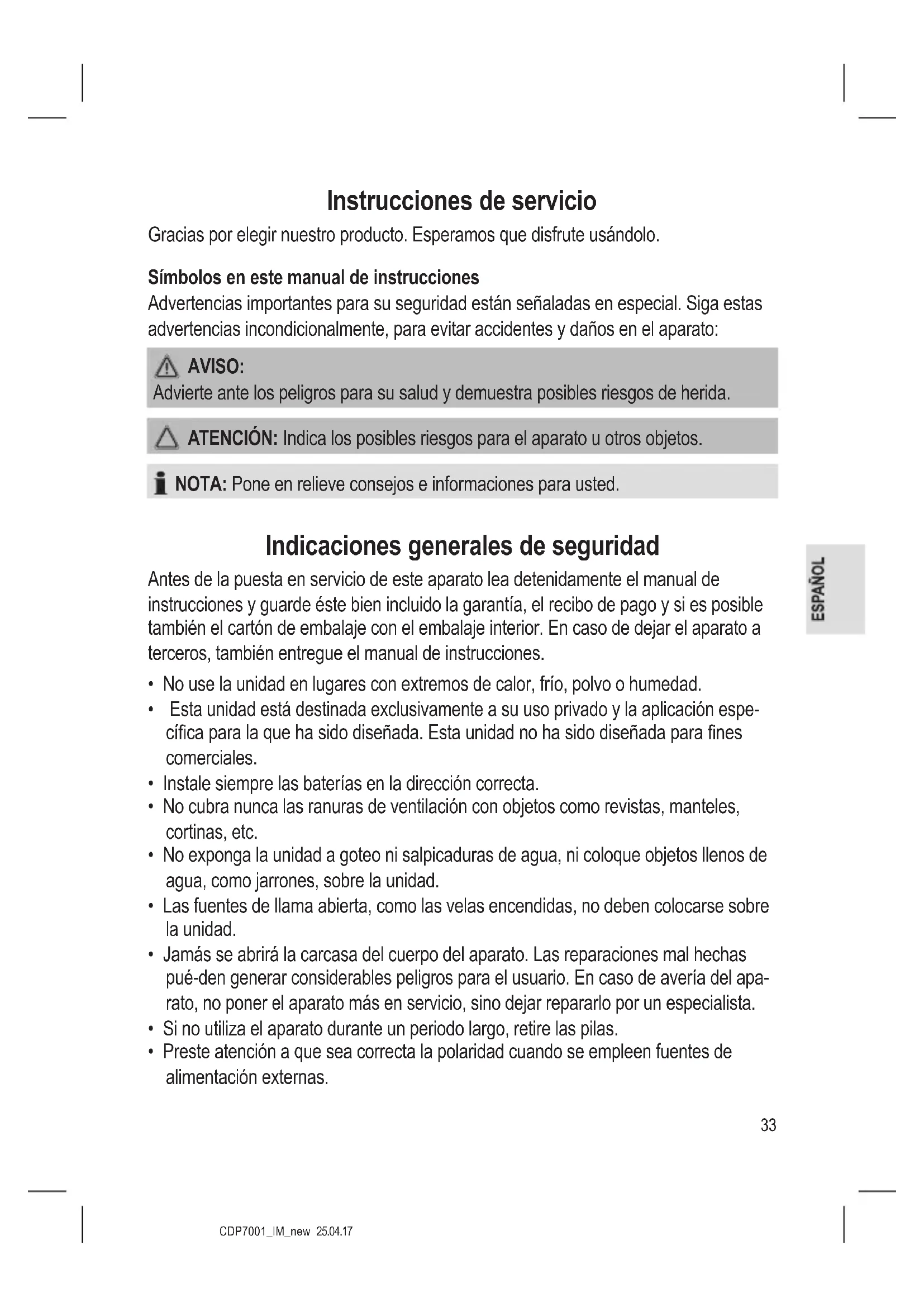 - Seque con un paño suave y seco. Datos técnicos Modelo: ..............................................................................................................CDP 7001 Adaptador de red: ............................................ 4,5 - 5 V CC, 1000 mA, Polaridad Funcionamiento de pila: ...................................................................2 x 1,5 V, Tipo R6 / AA Peso neto: ......................................................................................................aprox. 0,2 kg El derecho de realizar modicaciones técnicas y de diseño en el curso del desarrollo continuo del producto está reservado. Este dispositivo cumple con todas las directrices CE actuales, como la directriz de compatibilidad electromagnética y de bajo voltaje, y está fabricada según las últimas normas de seguridad.CDP7001_IM_new 25.04.17