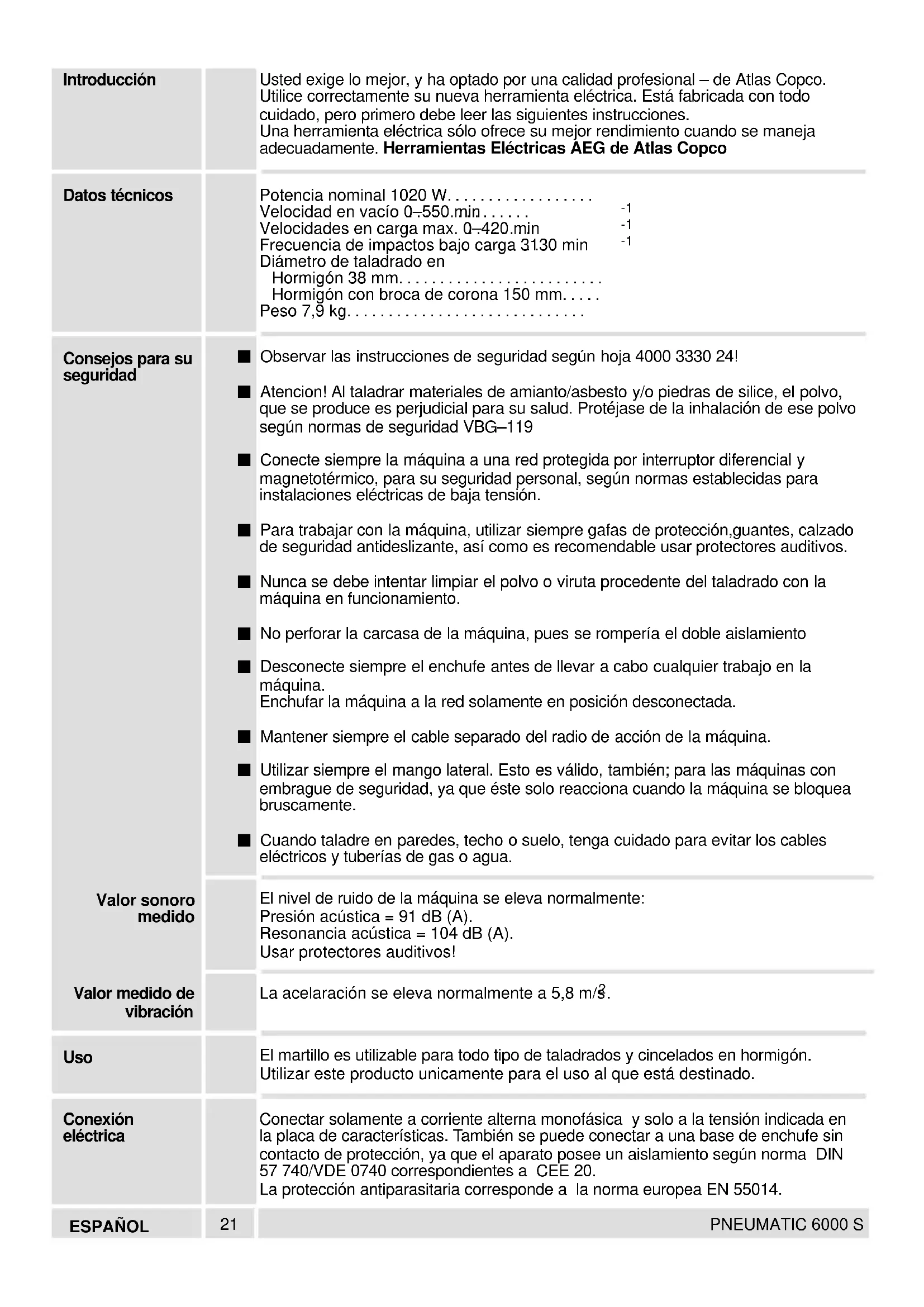 ESPAÑOL PNEUMATIC 6000 S Conexión: Pulse el interruptor Desconexión: Suelte el interruptor.. Las revoluciones se ajustan electrónicamente presionando más o menos el interruptor de conexión. El topede profundidad se puede utilizar, indistintamente; a la derecha o a la izquierda del mango lateral. Para ello enclavar el soporte del tope de profundidad en el mango lateral hasta que el corrojo encaje a tope. Para extraer el tope de profundidad, presionar en el cerrojo y tirar hacia fuera del soporte del tope. Para taladrar en serie a la misma profundidad, introducir el tope en el orificio correspondiente del mango lateral, y después de seleccionar la profundidad deseada fijarlo adecuadamente. El mango lateral se puede girar, para ello tal y como se muestra en la fotografía aflojar el mango, girarlo hasta alcanzar la posición deseada y volver a apretarlo firmemente. El mango lateral se puede utilizar fijado en el lateral de la carcasa.Esta posición es la apropiada para taladrar hacia abajo (suelo), o hacia arriba (techo). Para ello desenroscar el mango de su soporte delantero y enroscarlo en el orificio correspondiente del lateral de la carcasa. Control de conexión - desconexión Tope de profundidad Empuñadura25 ESPAÑOL PNEUMATIC 6000 S Ejerciendo más presión no se aumenta la eficacia de máquina. Con una presión moderada, funciona optimamente el dispositivo Antivibración; se observará con ello que los pliegues solo se cierran ligeramente. Con fuerte presión. se cerrarán los pliegues totalmente y la vibración se notará de manera apreciable en el mango. Saque la broca del taladro de vez en cuando para limpiar el polvo. Conmute a taladrado a percusión para hormigón, losetas y ladrillos duros, piedra, cemento duro y mármol (pero no cuando taladre la superficie de mármol). Para baldosas, piedras de pavimento, losetas y ladrillos blandos, cemento blando, ladrillos de cemento y cenizas de cok y yeso, cambie a taladrado normal. Use brocas para mampostería con punta de metal duro. Cuando taladre una superficie lisa dura (por ejemplo losetas), cubra el punto a taladrar con cinta adhesiva para impedir que resbale la punta de la broca. Cuando haya disminuído la potencia de la percusión, llevar la máquina al Servicio de Asistencia Técnica. Las ranuras de ventilación de la máquina deben estar despejadas en todo momento. La máquina viene equipada de origen con escobilla autodesconectantes. Ello evita que los muelles de las escobillas puedan dañar el colector del rotor cuando se gastan. Si las escobillas desconectan o disminuye la potencia de percusión, por favor póngase en contacto con su centro de servicio autorizado AEG. De este modo, la máquina estará siempre preparada para trabajar y ofrecerá una larga vida de servicio. Solo se deben utilizar accesorios y piezas de repuestos AEG. Piezas cuyo recambio no está descrito en las instrucciones de uso, deben sustituirse en un centro de asistencia técnica AEG (Consulte el folleto Garantia/Direcciones de Centros de Asistencia Técnica). En caso necesario, puede solicitar un despiece de la herramienta. Por favor indique el número de impreso de diez dígitos que hay en la etiqueta y pida el despiece a la siguiente dirección: Atlas Copco Elektrowerkzeuge GmbH, Postfach 320, D–71361 Winnenden. Los accesorios y sus correspondientes números para pedido, están reflejados en nuestros catálogos. Sugerencias de trabajo Sugerencias Mantenimiento Accesorios26 PORTUGUES PNEUMATIC 6000 S Como pessoa exigente decidiu-se pela qualidade – qualidade Atlas Copco. Construimos para si uma ferramenta eléctrica duradoura e segura. Um trabalho eficiente e tanto quanto possível isento de perigo só é, no entanto possível se ler e observar as presentes instruções de serviço. Queremos que também no futuro se decida pelas Ferramentas eléctricas AEG da Atlas Copco Potência absorvida 1020 W. . . . . . . . . . . . . . . . Nº de rotações em vazio 0–550 min