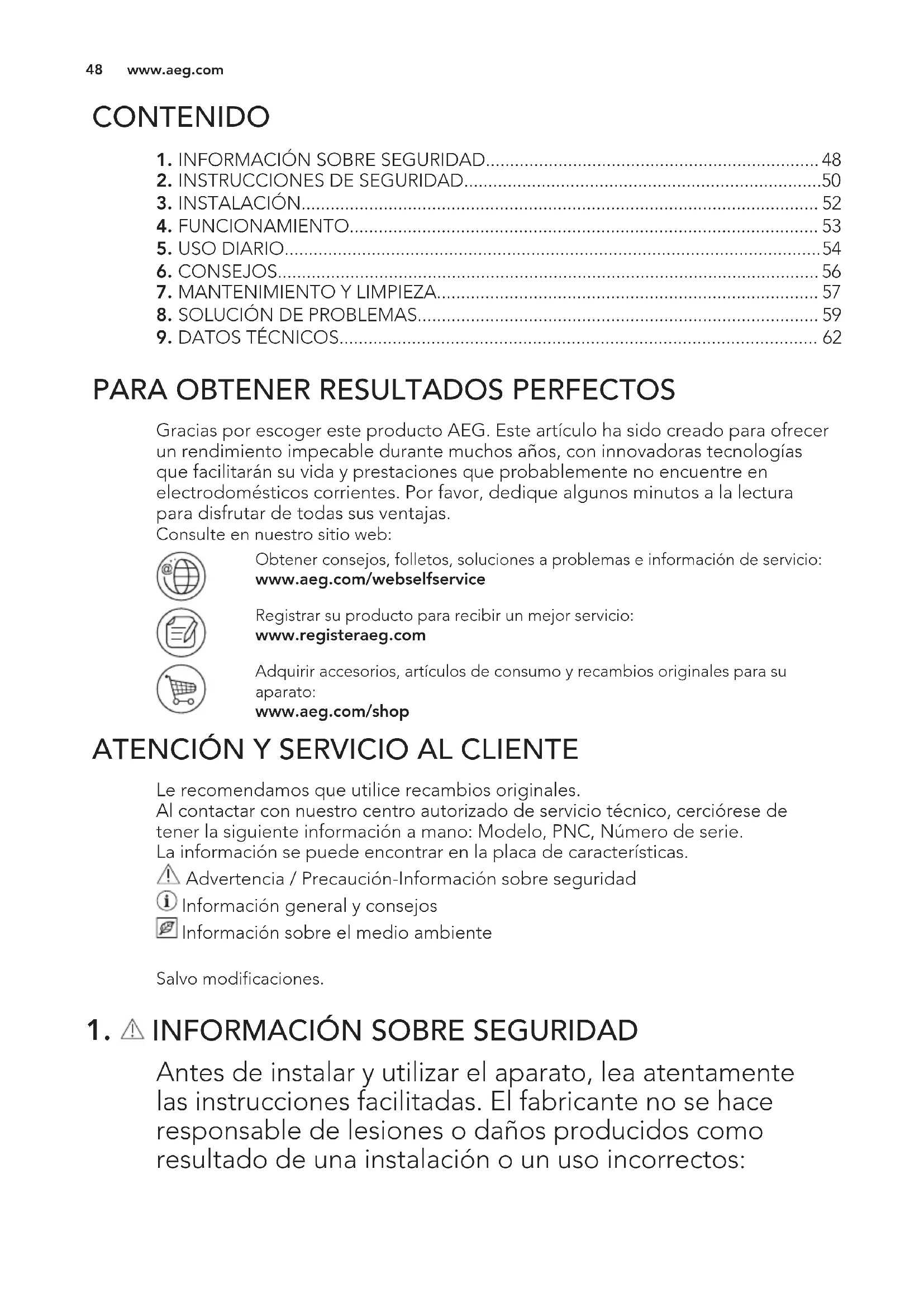 Antes de instalar y utilizar el aparato, lea atentamente las instrucciones facilitadas. El fabricante no se hace responsable de lesiones o daños producidos como resultado de una instalación o un uso incorrectos: www.aeg.com 48Conserve siempre estas instrucciones en lugar seguro y accesible para futuras consultas.