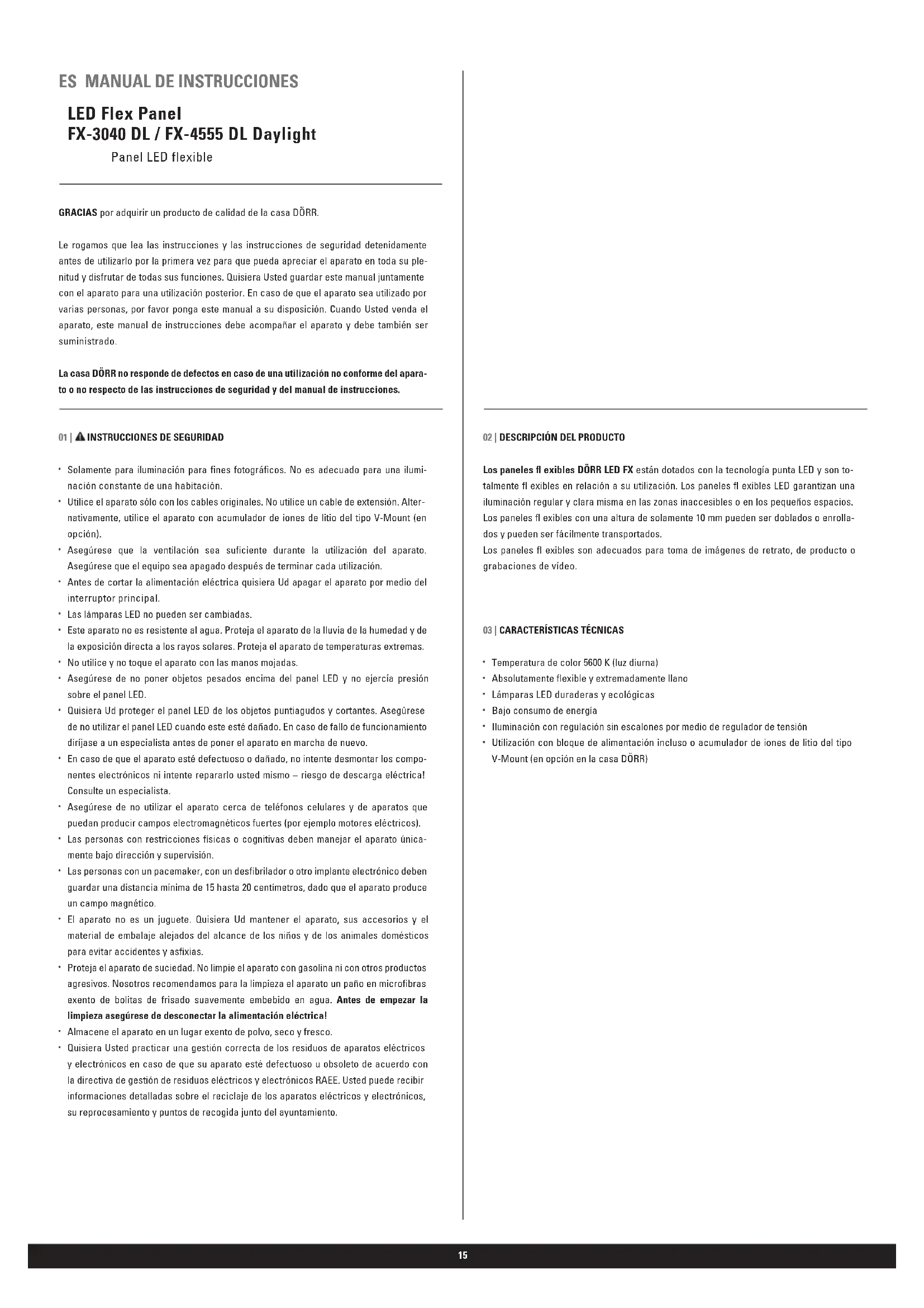 Le marquage imprimé CE satisfait aux exigences européennes en vigueur. Dénomination Article n° Di useur Softbox DÖRR pour FX-3040 DL/BC 373630 Di useur Softbox DÖRR pour FX-4555 DL/BC 373631 Flag Panel DÖRR pour FX-3040 DL/BC 373632 Flag Panel DÖRR pour FX-4555 DL/BC 373633 Accumulateur compacte lithium-ion du type V-Mount DÖRR CVL-65 14.8V, 65Wh 980715 Accumulateur compacte lithium-ion du type V-Mount DÖRR CVL-98 14.8V, 98Wh 98071615 GRACIAS por adquirir un producto de calidad de la casa DÖRR. Le rogamos que lea las instrucciones y las instrucciones de seguridad detenidamente antes de utilizarlo por la primera vez para que pueda apreciar el aparato en toda su ple- nitud y disfrutar de todas sus funciones. Quisiera Usted guardar este manual juntamente con el aparato para una utilización posterior. En caso de que el aparato sea utilizado por varias personas, por favor ponga este manual a su disposición. Cuando Usted venda el aparato, este manual de instrucciones debe acompañar el aparato y debe también ser suministrado. La casa DÖRR no responde de defectos en caso de una utilización no conforme del apara- to o no respecto de las instrucciones de seguridad y del manual de instrucciones. 01 |