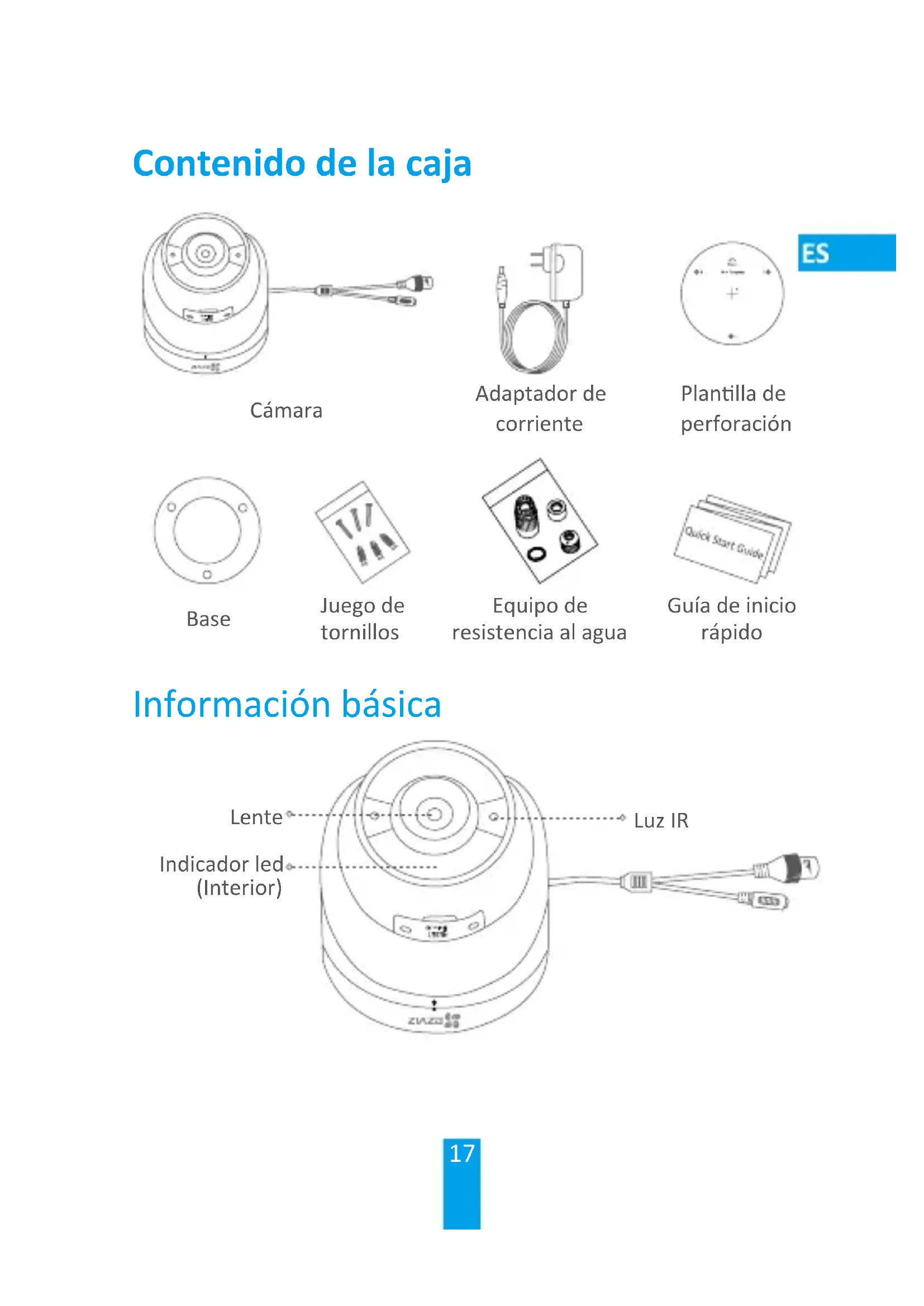 Lösen Sie den Drehknopf. Drehen Sie die Kamera wie abgebildet. Nähere Informaonen nden Sie auf www.ezvizlife.com.17 Cámara Adaptador de corriente Planlla de perforación Base Juego de tornillos Equipo de resistencia al agua Guía de inicio rápido Información básica Indicador led (Interior) Luz IR Lente Contenido de la caja18 Botón de reinicio Ranura para tarjetas microSD Conexión de red Conexión de alimentación Nombre Descripción Luz IR La Luz IR se enciende automácamente en condiciones de poca luz, lo que hace que la imagen sea más clara. Indicador led • Rojo jo: la cámara se está iniciando.