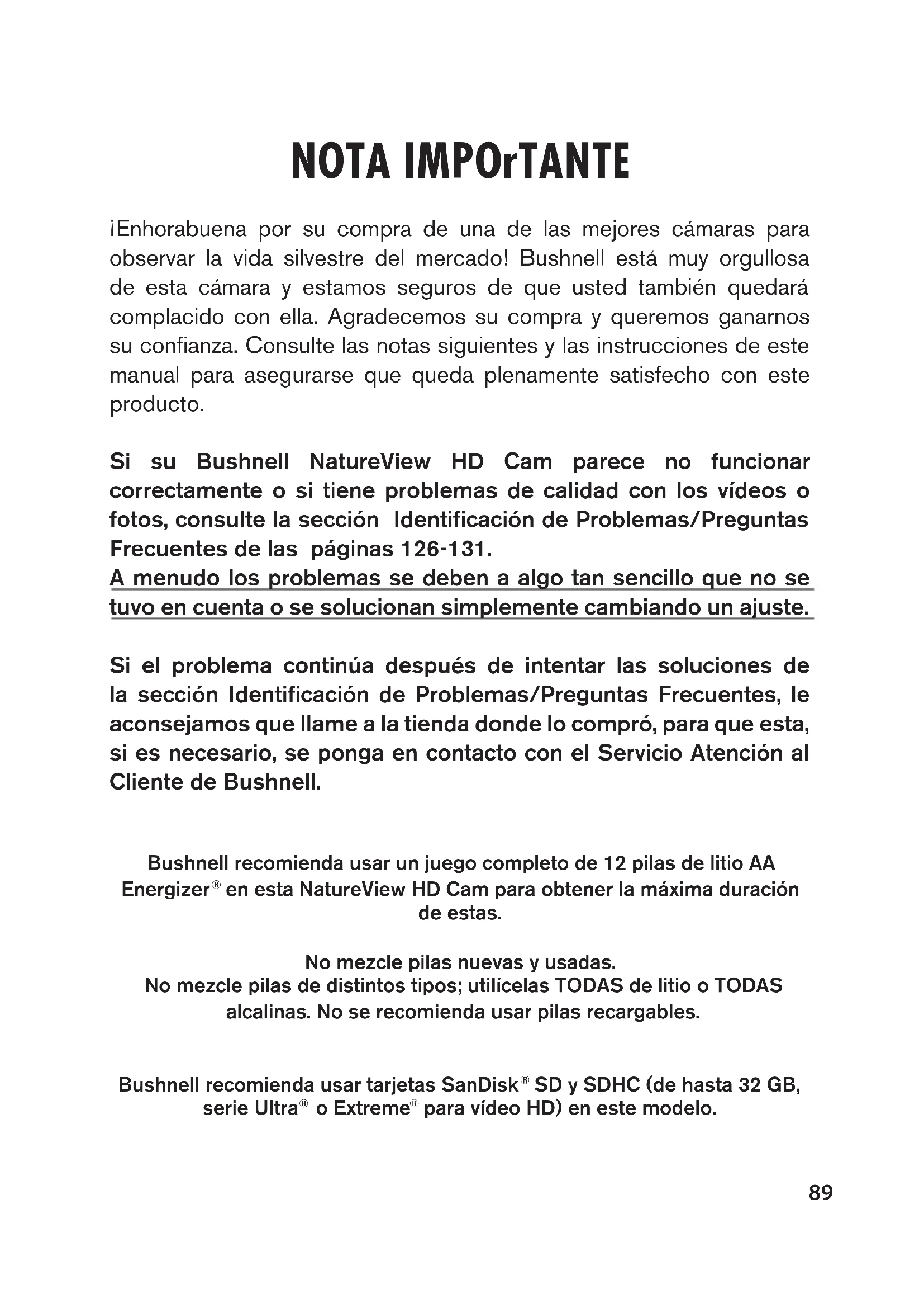 Modelo: 119740 05-15 VIDEO CAM89 NOTA IMPOrTANTE ¡Enhorabuena por su compra de una de las mejores cámaras para observar la vida silvestre del mercado! Bushnell está muy orgullosa de esta cámara y estamos seguros de que usted también quedará complacido con ella. Agradecemos su compra y queremos ganarnos su confianza. Consulte las notas siguientes y las instrucciones de este manual para asegurarse que queda plenamente satisfecho con este producto. Si su Bushnell NatureView HD Cam parece no funcionar correctamente o si tiene problemas de calidad con los vídeos o fotos, consulte la sección Identificación de Problemas/Preguntas Frecuentes de las páginas 126-131. A menudo los problemas se deben a algo tan sencillo que no se tuvo en cuenta o se solucionan simplemente cambiando un ajuste. Si el problema continúa después de intentar las soluciones de la sección Identificación de Problemas/Preguntas Frecuentes, le aconsejamos que llame a la tienda donde lo compró, para que esta, si es necesario, se ponga en contacto con el Servicio Atención al Cliente de Bushnell. Bushnell recomienda usar un juego completo de 12 pilas de litio AA Energizer