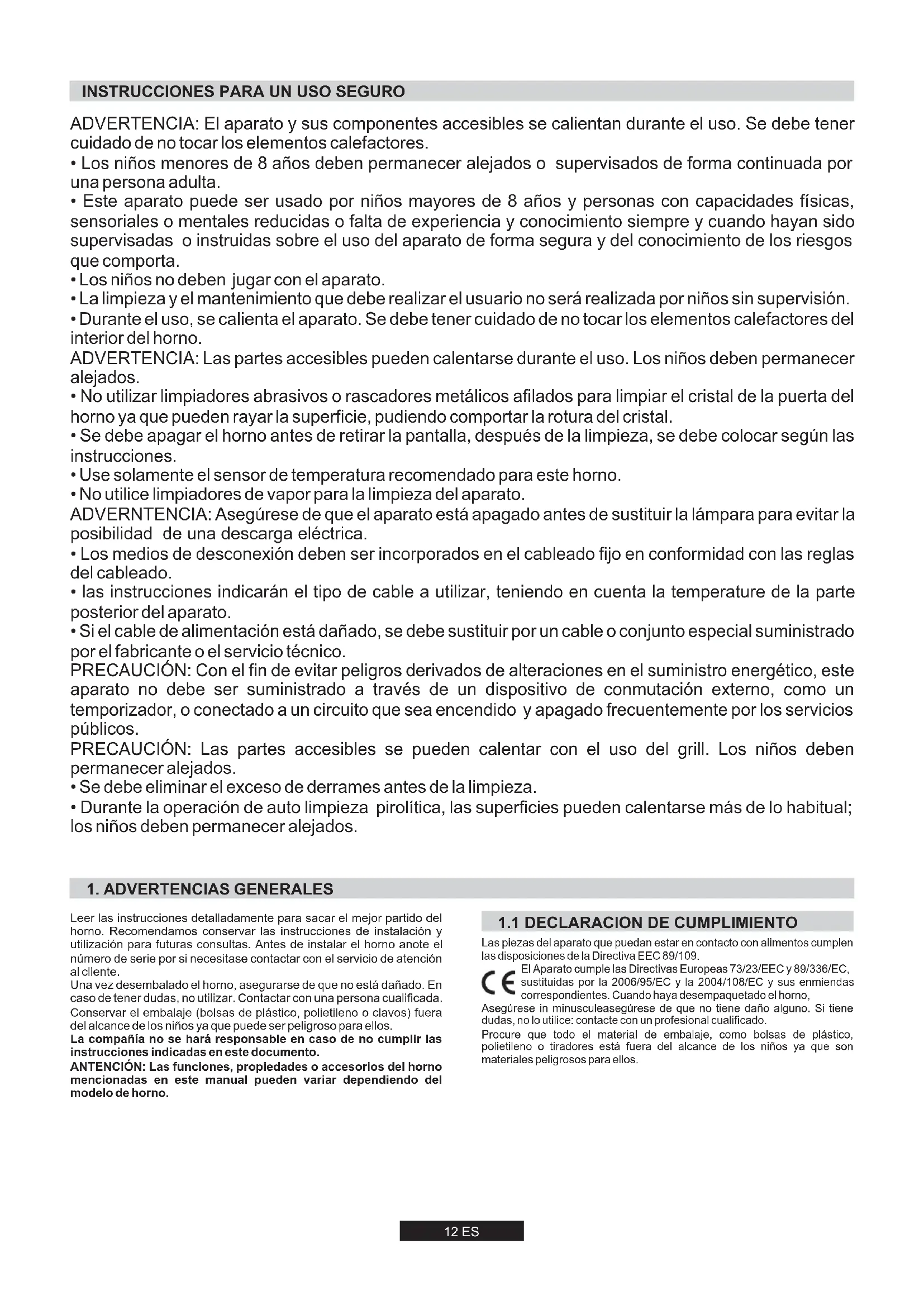 1.1 DECLARACION DE CUMPLIMIENTO* Además de los accesorios proporcionados con el horno, sugerimos