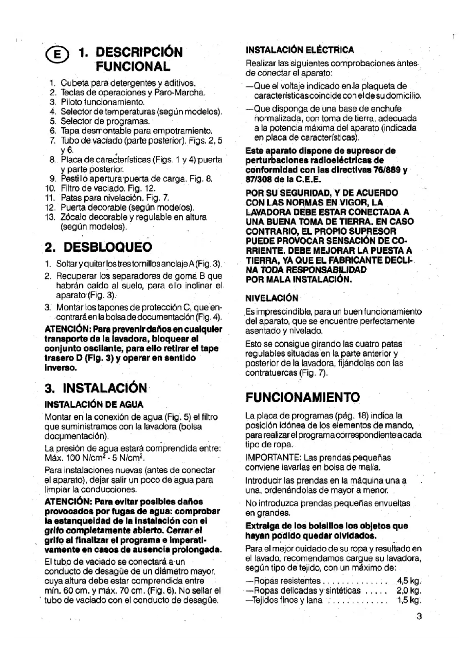 POR MALA INSTALACIÓN. NIVELACIÓN Es imprescindible, para un buen funcionamiento del aparato, que se encuentre perfectamente asentado y nivelado. Esto se consigue girando las cuatro patas regulables situadas en la parte anterior y posterior de la lavadora, fijándolas con las contratuercas (Fig. 7). FUNCIONAMIENTO La placa de programas (pág. 18) indica la posición idónea de los elementos de mando, para realizar el programa correspondiente acada tipo de ropa. IMPORTANTE: Las prendas pequeñas conviene lavarlas en bolsa de malla. Introducir las prendas en la máquina una a una, ordenándolas de mayor a menor. No introduzca prendas pequeñas envueltas en grandes. Extraiga de los bolsillos los objetos que hayan podido quedar olvidados. Para el mejor cuidado de su ropa y resultado en el lavado, recomendamos cargue su lavadora, según tipo de tejido, con un máximo de: —Ropas resistentes............................ 4,5 kg. —Ropas delicadas y sintéticas