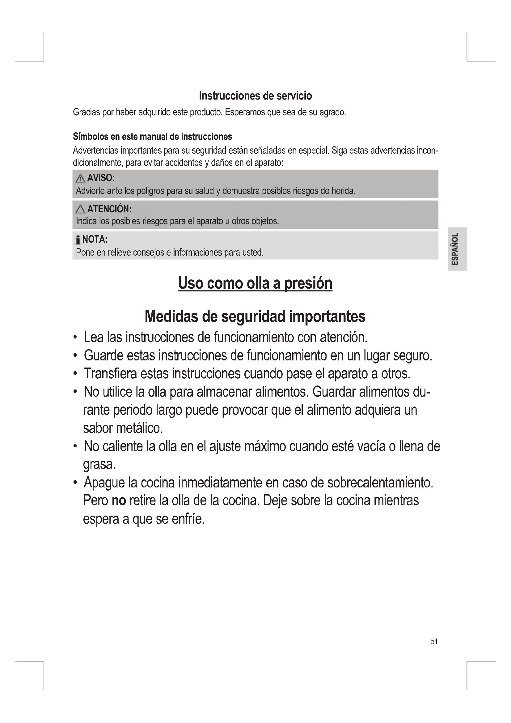 - Esta olla utiliza la presión para cocinar los alimentos. El uso inco- rrecto puede provocar quemaduras. Asegúrese de que la olla a presión está cerrada correctamente antes de colocarla sobre el fogón. Encontrará más información a lo largo de estas instruccio- nes de funcionamiento.