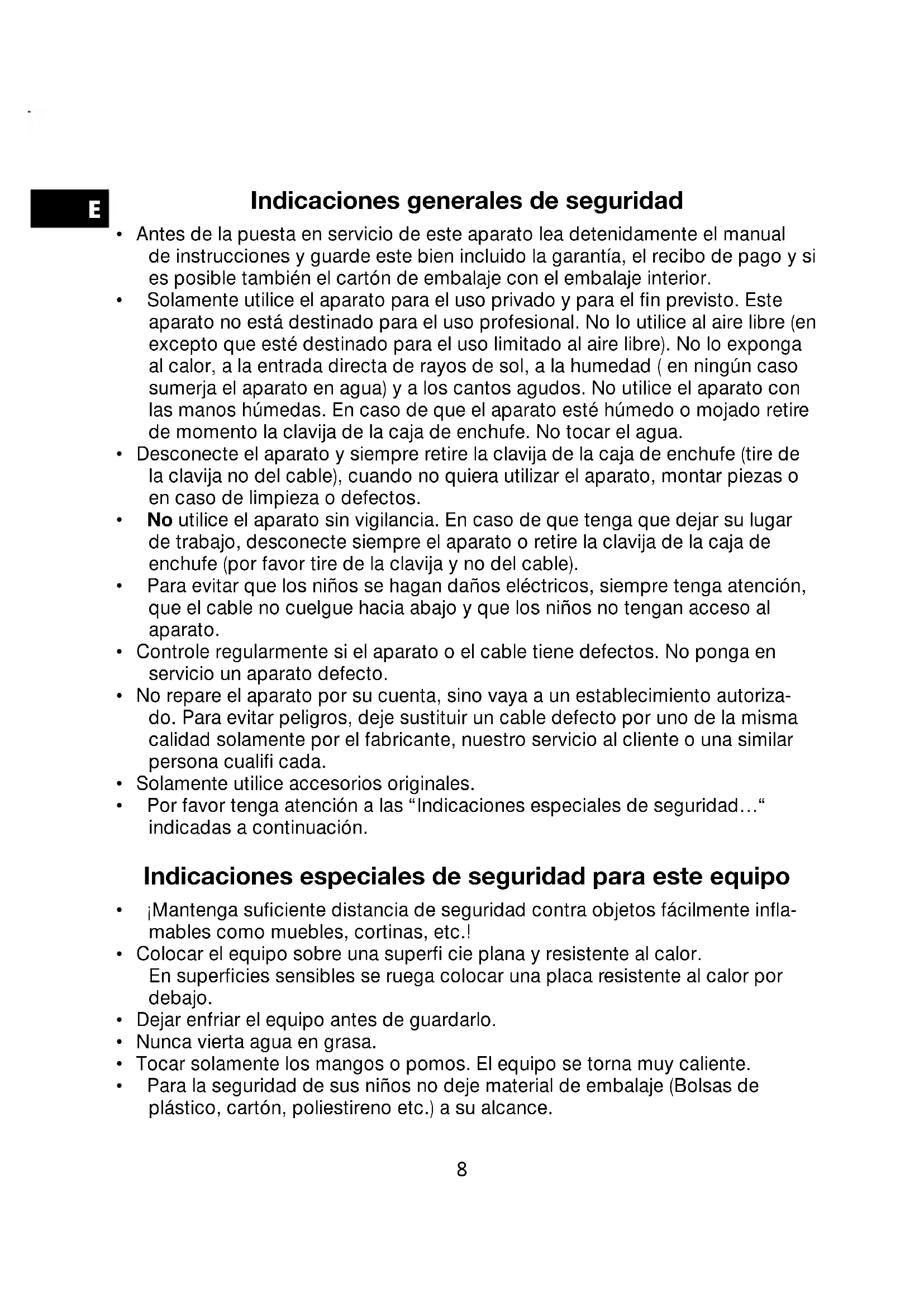 - Antes de la puesta en servicio de este aparato lea detenidamente el manual de instrucciones y guarde este bien incluido la garantía, el recibo de pago y si es posible también el cartón de embalaje con el embalaje interior.