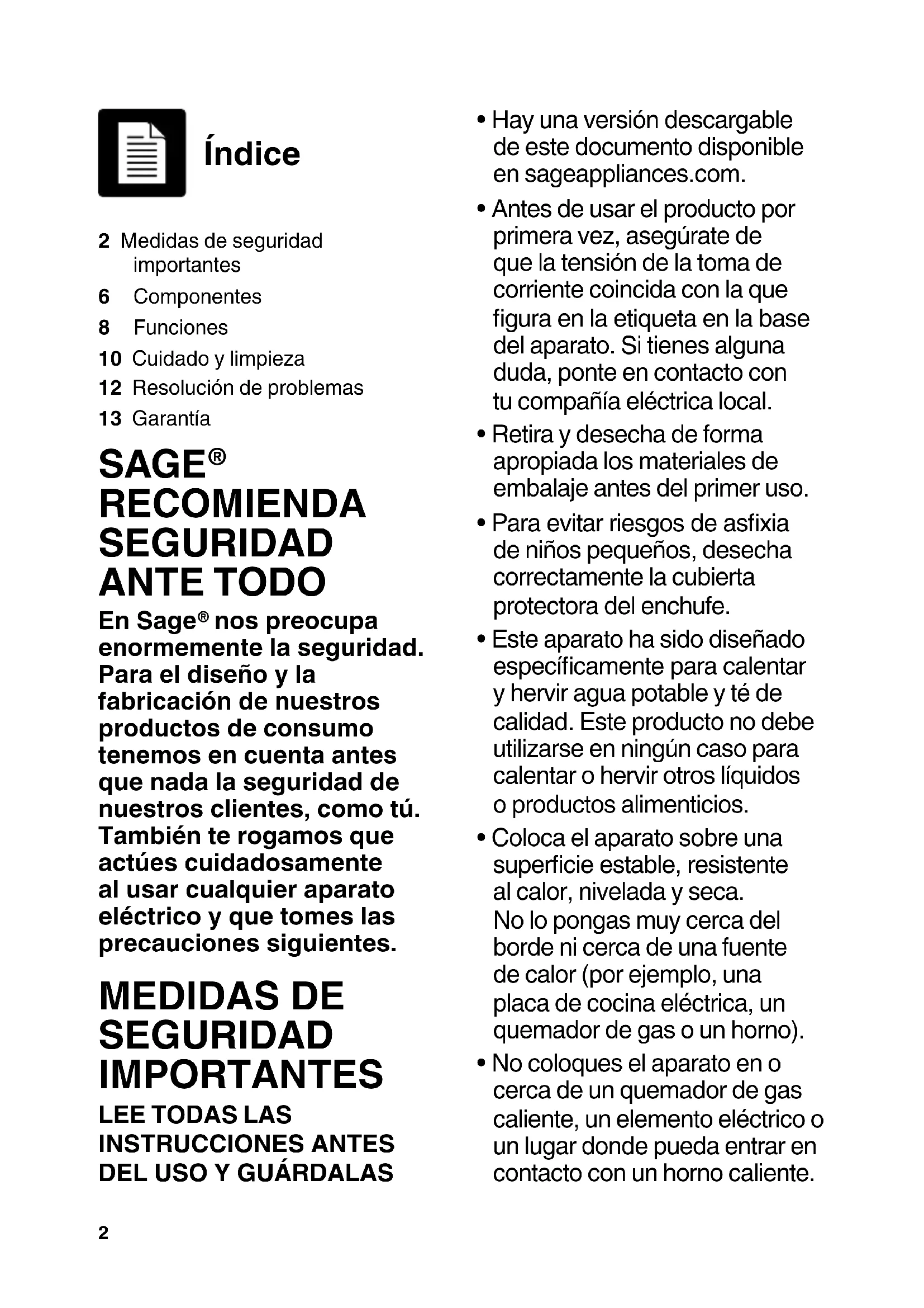 En Sage® nos preocupa enormamente la seguridad. Para el Diseño y la fabricación de nuestros productos de consumo tenemos en cuenta antes que nada lacurity de nuestros clients, como tú. también te rogamos que actúes cuidadosamente al usarrialquier aparato electrico y que tomes las precauciones siguientes.