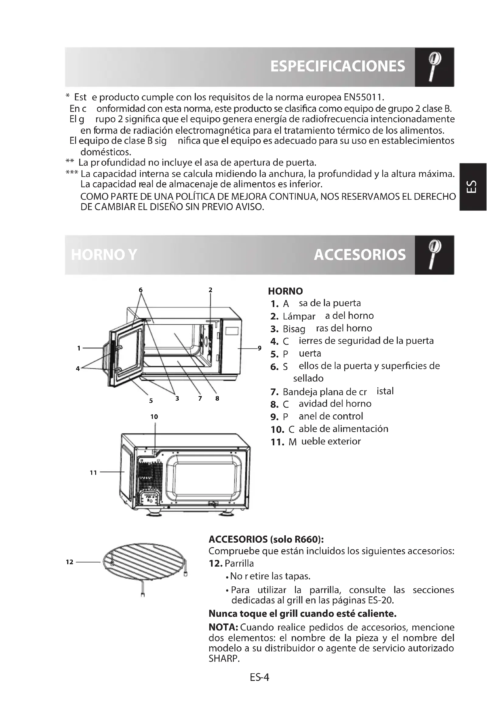 - Para utilizar la parrilla, consulte las secciones dedicadas al grill en las páginas ES-20. Nunca toque el grill cuando esté caliente. NOTA: Cuando realice pedidos de accesorios, mencione dos elementos: el nombre de la pieza y el nombre del modelo a su distribuidor o agente de servicio autorizado SHARP.