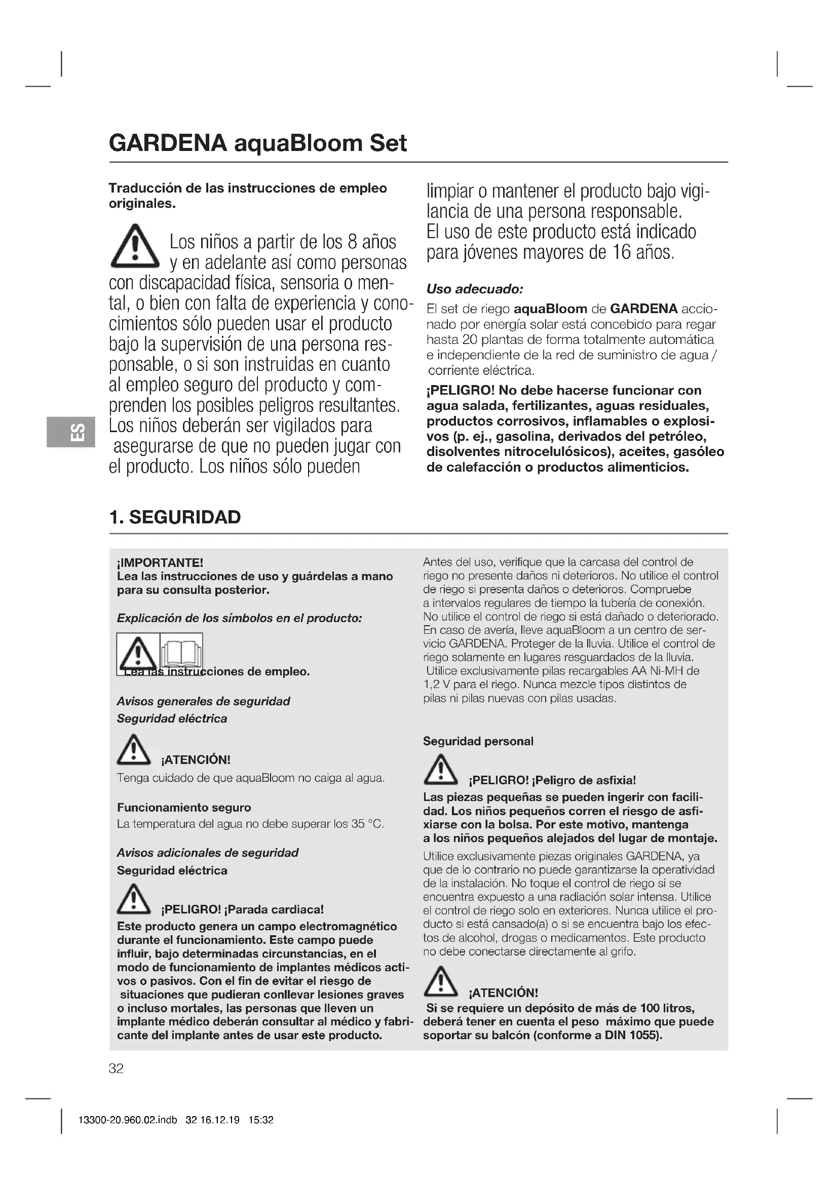 13300-20.960.02.indb 31 16.12.19 15:32Traducción de las instrucciones de empleo originales. Los niños a partir de los 8 años y en adelante así como personas con discapacidad física, sensoria o men- tal, o bien con falta de experiencia y cono- cimientos sólo pueden usar el producto bajo la supervisión de una persona res- ponsable, o si son instruidas en cuanto al empleo seguro del producto y com- prenden los posibles peligros resultantes. Los niños deberán ser vigilados para asegurarse de que no pueden jugar con el producto. Los niños sólo pueden limpiar o mantener el producto bajo vigi- lancia de una persona responsable. El uso de este producto está indicado para jóvenes mayores de 16 años. Uso adecuado: El set de riego aquaBloom de GARDENA accio- nado por energía solar está concebido para regar hasta 20plantas de forma totalmente automática e independiente de la red de suministro de agua / corriente eléctrica. ¡PELIGRO! No debe hacerse funcionar con agua salada, fertilizantes, aguas residuales, productos corrosivos, inflamables o explosi- vos (p. ej., gasolina, derivados del petróleo, disolventes nitrocelulósicos), aceites, gasóleo de calefacción o productos alimenticios.