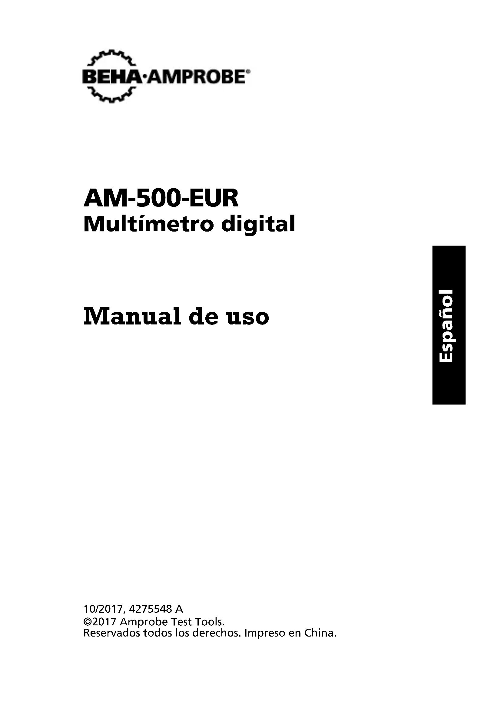 F2Español AM-500-EUR Multímetro digital Manual de uso 10/2017, 4275548 A ©2017 Amprobe Test Tools. Reservados todos los derechos. Impreso en China.Garantía limitada y limitación de responsabilidades Su producto de Amprobe está garantizado contra defectos de material y mano de obra durante 1 año a partir de la fecha de compra, salvo que la legislación de su país estipule lo contrario. Esta garantía no cubre fusibles, baterías desechables, ni daños derivados de accidentes, negligencia, uso indebido, alteración, contaminación o condiciones anormales de uso o manipulación. Los revendedores no están autorizados a extender ninguna otra garantía en nombre de Amprobe. Para obtener servicio durante el período de garantía, devuelva el producto acompañado del comprobante de compra a un centro de servicio de Amprobe autorizado o a un concesionario o distribuidor de Amprobe. Consulte el apartado Reparación para obtener información más detallada. ESTA GARANTÍA CONSTITUYE SU ÚNICO RECURSO. TODAS LAS DEMÁS GARANTÍAS, TANTO EXPRESAS COMO IMPLÍCITAS O ESTATUTARIAS, INCLUIDAS LAS GARANTÍAS IMPLÍCITAS DE IDONEIDAD PARA UN PROPÓSITO DETERMINADO O DE COMERCIABILIDAD, QUEDAN POR LA PRESENTE DENEGADAS. EL FABRICANTE NO SERÁ RESPONSABLE DE LOS DAÑOS O PÉRDIDAS ESPECIALES, INDIRECTOS, CONTINGENTES O RESULTANTES, QUE SE DERIVEN DE CUALQUIER CAUSA O TEORÍA. Debido a que determinados estados o países no permiten la exclusión o limitación de una garantía implícita o de los daños contingentes o resultantes, esta limitación de responsabilidad puede no regir para usted. Reparación Todas las herramientas de prueba que se devuelvan para su reparación, cubierta o no por garantía, o para su calibración, deben ir acompañadas de lo siguiente: su nombre, el nombre de su empresa, el domicilio, el número de teléfono y el comprobante de compra. Además, incluya una breve descripción del problema o del servicio solicitado y adjunte los conductores de prueba del medidor. La reparación fuera de garantía o los cargos de sustitución deben remitirse en la forma de cheque, giro postal, tarjeta de crédito con fecha de vencimiento u orden de compra pagadera a Amprobe®. Reparaciones y sustituciones cubiertas por la garantía – Todos los países Sírvase leer la declaración de garantía y compruebe las baterías antes de solicitar la reparación. Durante el período de garantía, toda herramienta de prueba defectuosa puede devolverse al distribuidor de Amprobe® para cambiarla por otra igual o por unproducto similar. Consulte el apartado “Where to buy” en www. amprobe.com para ver una lista de distribuidores locales. Asimismo, las unidades de reparación en garantía y las unidades de reemplazo en los Estados Unidos y Canadá también pueden enviarse al Centro de servicio Amprobe® (consulte la dirección más abajo). Reparaciones y sustituciones no cubiertas por la garantía – Estados Unidos y Canadá Las reparaciones fuera de la garantía en los Estados Unidos y Canadá deben enviarse a un Centro de servicio de Amprobe®. Llame a Amprobe® o pregunte en su punto de compra para conocer las tarifas actuales de reparación y sustitución de productos. En Estados Unidos En Canadá Amprobe Amprobe Everett, WA 98203 Mississauga, Ontario L4Z 1X9 Tel.: 877-AMPROBE (267-7623) Tel.: 905-890-7600 Reparaciones y sustituciones no cubiertas por la garantía – Europa El distribuidor de Amprobe® puede sustituir las unidades vendidas en Europa no cubiertas por la garantía por un coste nominal. Consulte el apartado “Where to buy” en www.amprobe.com para ver una lista de distribuidores locales. Dirección para envío de correspondencia en Europa* Amprobe® Test Tools Europe Beha-Amprobe GmbH In den Engematten 14 79286 Glottertal, Alemania Tel.: +49 (0) 7684 8009 - 0 www.beha-amprobe.com *(Correspondencia solamente. En esta dirección no se proporcionan reparaciones ni sustituciones de productos. Los clientes europeos deben ponerse en contacto con su distribuidor).AM-500-EUR Multímetro digital