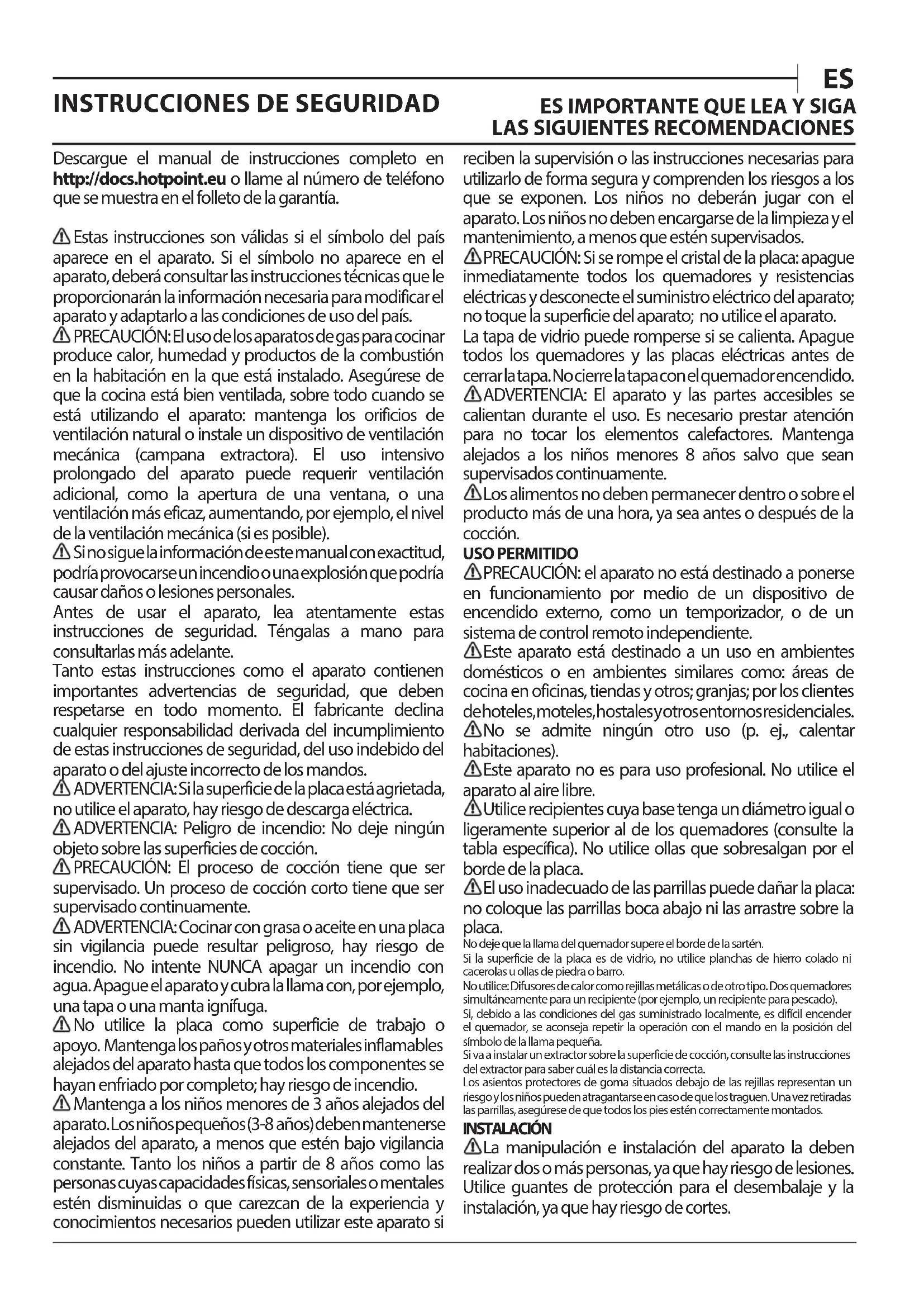 Manuale d’uso ITDescargue el manual de instrucciones completo en http://docs.hotpoint.eu o llame al número de teléfono que se muestra en el folleto de la garantía. Estas instrucciones son válidas si el símbolo del país aparece en el aparato. Si el símbolo no aparece en el aparato, deberá consultar las instrucciones técnicas que le proporcionarán la información necesaria para modificar el aparato y adaptarlo a las condiciones de uso del país. PRECAUCIÓN: El uso de los aparatos de gas para cocinar produce calor, humedad y productos de la combustión en la habitación en la que está instalado. Asegúrese de que la cocina está bien ventilada, sobre todo cuando se está utilizando el aparato: mantenga los orificios de ventilación natural o instale un dispositivo de ventilación mecánica (campana extractora). El uso intensivo prolongado del aparato puede requerir ventilación adicional, como la apertura de una ventana, o una ventilación más eficaz, aumentando, por ejemplo, el nivel de la ventilación mecánica (si es posible). Si no sigue la información de este manual con exactitud, podría provocarse un incendio o una explosión que podría causar daños o lesiones personales. Antes de usar el aparato, lea atentamente estas instrucciones de seguridad. Téngalas a mano para consultarlas más adelante. Tanto estas instrucciones como el aparato contienen importantes advertencias de seguridad, que deben respetarse en todo momento. El fabricante declina cualquier responsabilidad derivada del incumplimiento de estas instrucciones de seguridad, del uso indebido del aparato o del ajuste incorrecto de los mandos. ADVERTENCIA: Si la superficie de la placa está agrietada, no utilice el aparato, hay riesgo de descarga eléctrica. ADVERTENCIA: Peligro de incendio: No deje ningún objeto sobre las superficies de cocción. PRECAUCIÓN: El proceso de cocción tiene que ser supervisado. Un proceso de cocción corto tiene que ser supervisado continuamente. ADVERTENCIA: Cocinar con grasa o aceite en una placa sin vigilancia puede resultar peligroso, hay riesgo de incendio. No intente NUNCA apagar un incendio con agua. Apague el aparato y cubra la llama con, por ejemplo, una tapa o una manta ignífuga. No utilice la placa como superficie de trabajo o apoyo. Mantenga los paños y otros materiales inflamables alejados del aparato hasta que todos los componentes se hayan enfriado por completo; hay riesgo de incendio. Mantenga a los niños menores de 3 años alejados del aparato. Los niños pequeños (3-8años) deben mantenerse alejados del aparato, a menos que estén bajo vigilancia constante. Tanto los niños a partir de 8 años como las personas cuyas capacidades físicas, sensoriales o mentales estén disminuidas o que carezcan de la experiencia y conocimientos necesarios pueden utilizar este aparato si reciben la supervisión o las instrucciones necesarias para utilizarlo de forma segura y comprenden los riesgos a los que se exponen. Los niños no deberán jugar con el aparato. Los niños no deben encargarse de la limpieza y el mantenimiento, a menos que estén supervisados. PRECAUCIÓN: Si se rompe el cristal de la placa: apague inmediatamente todos los quemadores y resistencias eléctricas y desconecte el suministro eléctrico del aparato; no toque la superficie del aparato; no utilice el aparato. La tapa de vidrio puede romperse si se calienta. Apague todos los quemadores y las placas eléctricas antes de cerrar la tapa. No cierre la tapa con el quemador encendido. ADVERTENCIA: El aparato y las partes accesibles se calientan durante el uso. Es necesario prestar atención para no tocar los elementos calefactores. Mantenga alejados a los niños menores 8 años salvo que sean supervisados continuamente. Los alimentos no deben permanecer dentro o sobre el producto más de una hora, ya sea antes o después de la cocción. USO PERMITIDO PRECAUCIÓN: el aparato no está destinado a ponerse en funcionamiento por medio de un dispositivo de encendido externo, como un temporizador, o de un sistema de control remoto independiente. Este aparato está destinado a un uso en ambientes domésticos o en ambientes similares como: áreas de cocina en oficinas, tiendas y otros; granjas; por los clientes de hoteles, moteles, hostales y otros entornos residenciales. No se admite ningún otro uso (p. ej., calentar habitaciones). Este aparato no es para uso profesional. No utilice el aparato al aire libre. Utilice recipientes cuya base tenga un diámetro igual o ligeramente superior al de los quemadores (consulte la tabla específica). No utilice ollas que sobresalgan por el borde de la placa. El uso inadecuado de las parrillas puede dañar la placa: no coloque las parrillas boca abajo ni las arrastre sobre la placa. No deje que la llama del quemador supere el borde de la sartén.Si la superficie de la placa es de vidrio, no utilice planchas de hierro colado ni cacerolas u ollas de piedra o barro.No utilice: Difusores de calor como rejillas metálicas o de otro tipo. Dos quemadores simultáneamente para un recipiente (por ejemplo, un recipiente para pescado).Si, debido a las condiciones del gas suministrado localmente, es difícil encender el quemador, se aconseja repetir la operación con el mando en la posición del símbolo de la llama pequeña.Si va a instalar un extractor sobre la superficie de cocción, consulte las instrucciones del extractor para saber cuál es la distancia correcta.Los asientos protectores de goma situados debajo de las rejillas representan un riesgo y los niños pueden atragantarse en caso de que los traguen. Una vez retiradas las parrillas, asegúrese de que todos los pies estén correctamente montados. INSTALACIÓN La manipulación e instalación del aparato la deben realizar dos o más personas, ya que hay riesgo de lesiones. Utilice guantes de protección para el desembalaje y la instalación, ya que hay riesgo de cortes.