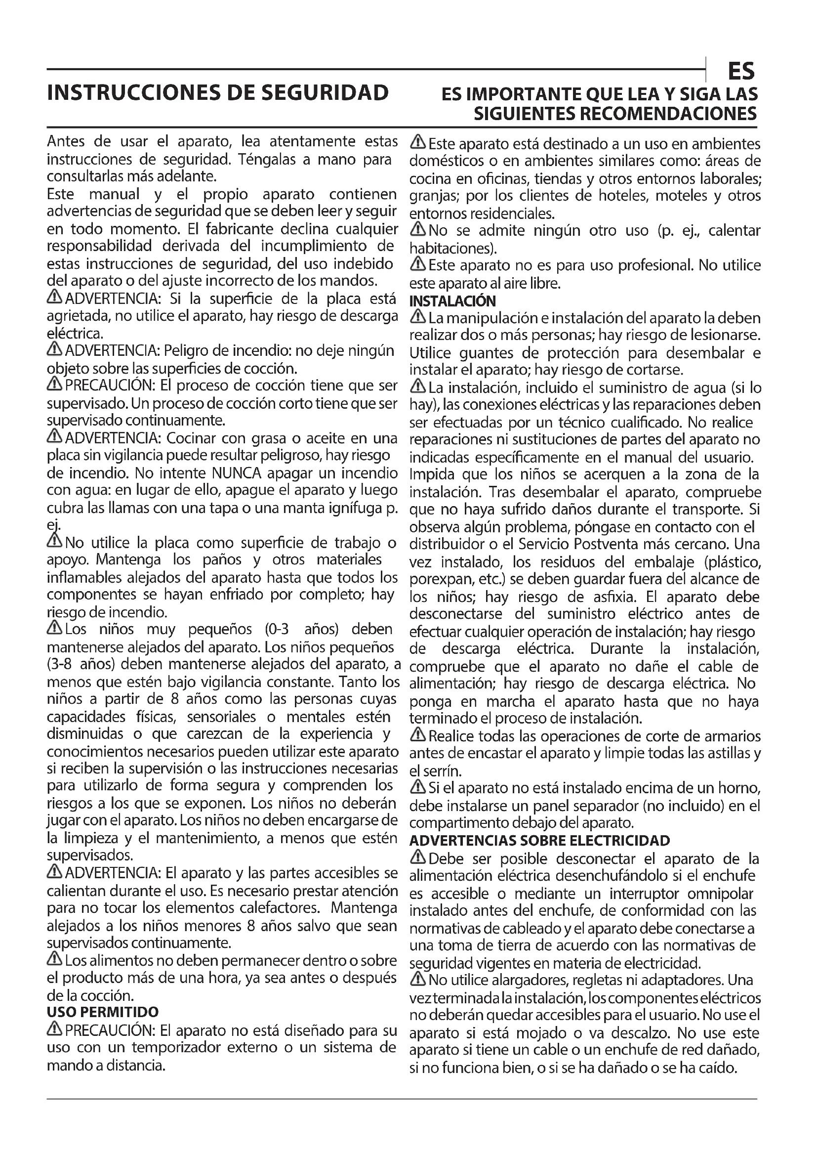 - Oppure, contattare il Servizio Assistenza Tecnica (al numero di telefono riportato sul libretto di garanzia). Prima di contattare il Servizio Assistenza Clienti, prepararsi a fornire i codici riportati sulla targhetta matricola del prodotto.Antes de usar el aparato, lea atentamente estas instrucciones de seguridad. Téngalas a mano para consultarlas más adelante. Este manual y el propio aparato contienen advertencias de seguridad que se deben leer y seguir en todo momento. El fabricante declina cualquier responsabilidad derivada del incumplimiento de estas instrucciones de seguridad, del uso indebido del aparato o del ajuste incorrecto de los mandos. ADVERTENCIA: Si la supercie de la placa está agrietada, no utilice el aparato, hay riesgo de descarga eléctrica. ADVERTENCIA: Peligro de incendio: no deje ningún objeto sobre las supercies de cocción. PRECAUCIÓN: El proceso de cocción tiene que ser supervisado. Un proceso de cocción corto tiene que ser supervisado continuamente. ADVERTENCIA: Cocinar con grasa o aceite en una placa sin vigilancia puede resultar peligroso, hay riesgo de incendio. No intente NUNCA apagar un incendio con agua: en lugar de ello, apague el aparato y luego cubra las llamas con una tapa o una manta ignífuga p. ej. No utilice la placa como supercie de trabajo o apoyo. Mantenga los paños y otros materiales inamables alejados del aparato hasta que todos los componentes se hayan enfriado por completo; hay riesgo de incendio. Los niños muy pequeños (0-3 años) deben mantenerse alejados del aparato. Los niños pequeños (3-8 años) deben mantenerse alejados del aparato, a menos que estén bajo vigilancia constante. Tanto los niños a partir de 8 años como las personas cuyas capacidades físicas, sensoriales o mentales estén disminuidas o que carezcan de la experiencia y conocimientos necesarios pueden utilizar este aparato si reciben la supervisión o las instrucciones necesarias para utilizarlo de forma segura y comprenden los riesgos a los que se exponen. Los niños no deberán jugar con el aparato. Los niños no deben encargarse de la limpieza y el mantenimiento, a menos que estén supervisados. ADVERTENCIA: El aparato y las partes accesibles se calientan durante el uso. Es necesario prestar atención para no tocar los elementos calefactores. Mantenga alejados a los niños menores 8 años salvo que sean supervisados continuamente. Los alimentos no deben permanecer dentro o sobre el producto más de una hora, ya sea antes o después de la cocción. USO PERMITIDO PRECAUCIÓN: El aparato no está diseñado para su uso con un temporizador externo o un sistema de mando a distancia. Este aparato está destinado a un uso en ambientes domésticos o en ambientes similares como: áreas de cocina en ocinas, tiendas y otros entornos laborales; granjas; por los clientes de hoteles, moteles y otros entornos residenciales. No se admite ningún otro uso (p. ej., calentar habitaciones). Este aparato no es para uso profesional. No utilice este aparato al aire libre. INSTALACIÓN La manipulación e instalación del aparato la deben realizar dos o más personas; hay riesgo de lesionarse. Utilice guantes de protección para desembalar e instalar el aparato; hay riesgo de cortarse. La instalación, incluido el suministro de agua (si lo hay), las conexiones eléctricas y las reparaciones deben ser efectuadas por un técnico cualicado. No realice reparaciones ni sustituciones de partes del aparato no indicadas especícamente en el manual del usuario. Impida que los niños se acerquen a la zona de la instalación. Tras desembalar el aparato, compruebe que no haya sufrido daños durante el transporte. Si observa algún problema, póngase en contacto con el distribuidor o el Servicio Postventa más cercano. Una vez instalado, los residuos del embalaje (plástico, porexpan, etc.) se deben guardar fuera del alcance de los niños; hay riesgo de asxia. El aparato debe desconectarse del suministro eléctrico antes de efectuar cualquier operación de instalación; hay riesgo de descarga eléctrica. Durante la instalación, compruebe que el aparato no dañe el cable de alimentación; hay riesgo de descarga eléctrica. No ponga en marcha el aparato hasta que no haya terminado el proceso de instalación. Realice todas las operaciones de corte de armarios antes de encastar el aparato y limpie todas las astillas y el serrín. Si el aparato no está instalado encima de un horno, debe instalarse un panel separador (no incluido) en el compartimento debajo del aparato.