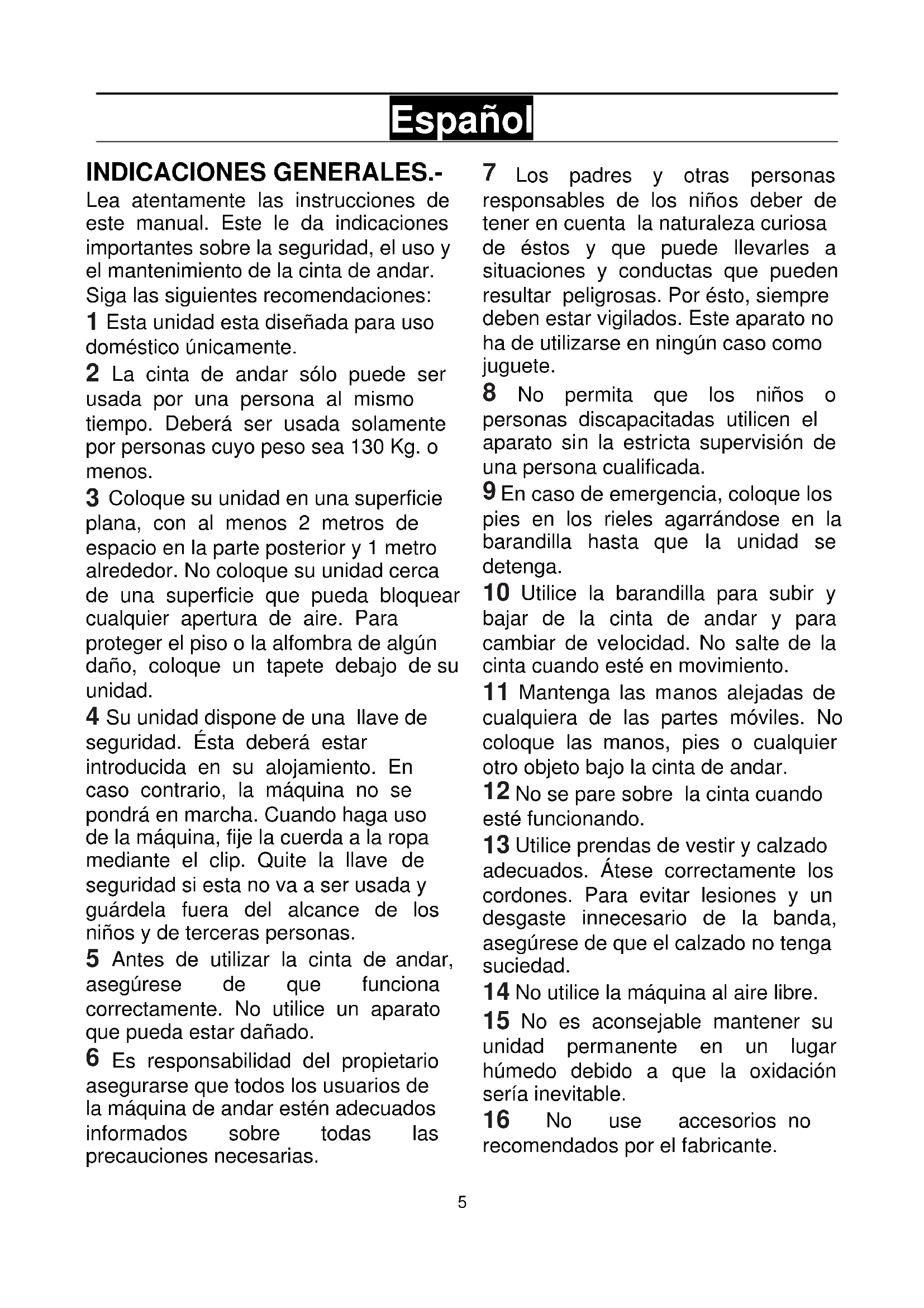 Fig.5 Fig.64 Fig.7 Fig.85 Español INDICACIONES GENERALES.- Lea atentamente las instrucciones de este manual. Este le da indicaciones importantes sobre la seguridad, el uso y el mantenimiento de la cinta de andar. Siga las siguientes recomendaciones: