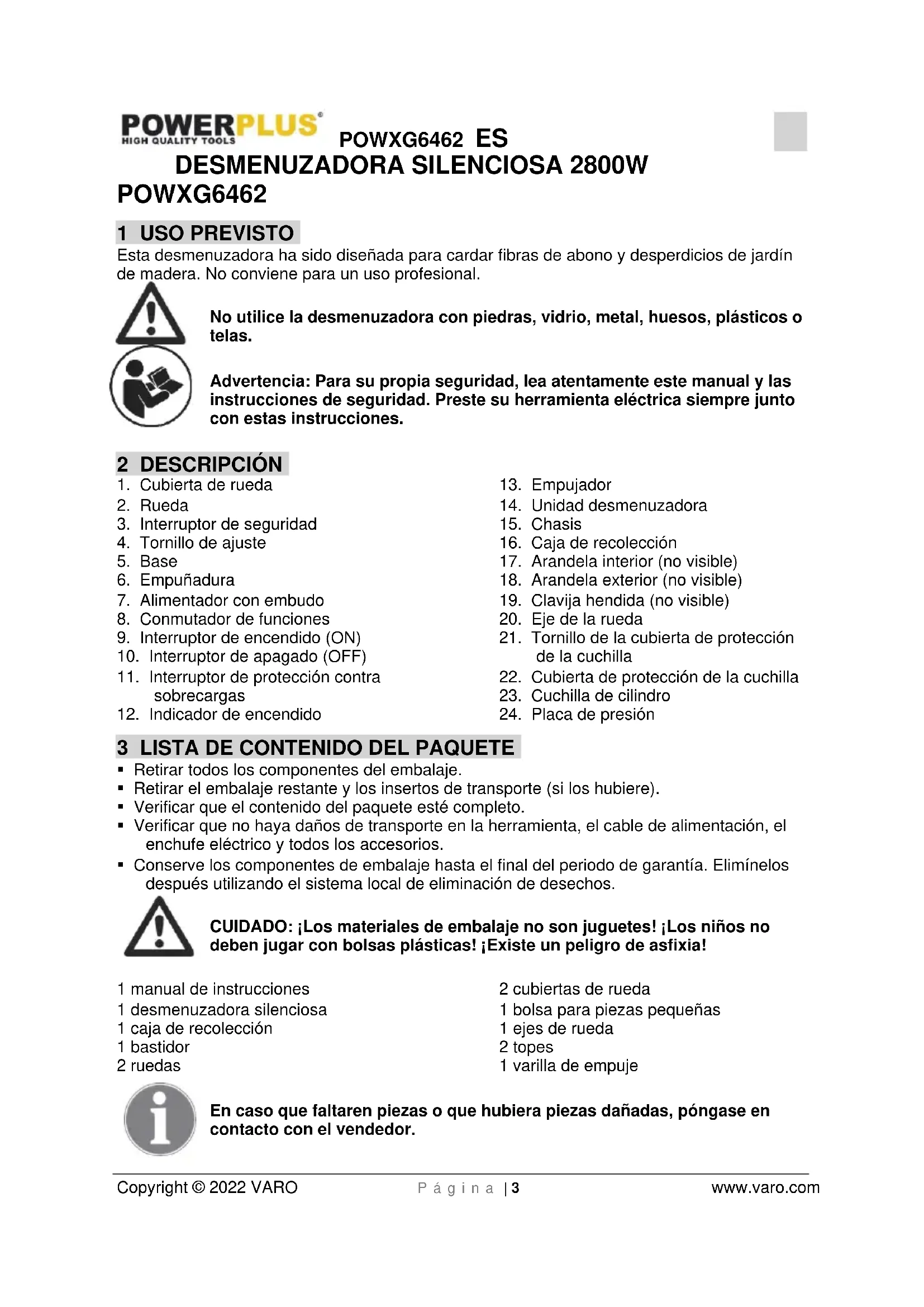 - Conserve los componentes de embalaje hasta el final del periodo de garantía. Elimínelos después utilizando el sistema local de eliminación de desechos. CUIDADO: ¡Los materiales de embalaje no son juguetes! ¡Los niños no deben jugar con bolsas plásticas! ¡Existe un peligro de asfixia! 1 manual de instrucciones 1 desmenuzadora silenciosa 1 caja de recolección 1 bastidor 2 ruedas 2 cubiertas de rueda 1 bolsa para piezas pequeñas 1 ejes de rueda 2 topes 1 varilla de empuje En caso que faltaren piezas o que hubiera piezas dañadas, póngase en contacto con el vendedor.POWXG6462 ES Copyright © 2022 VARO P á g i n a | 4 www.varo.com 4 SÍMBOLOS