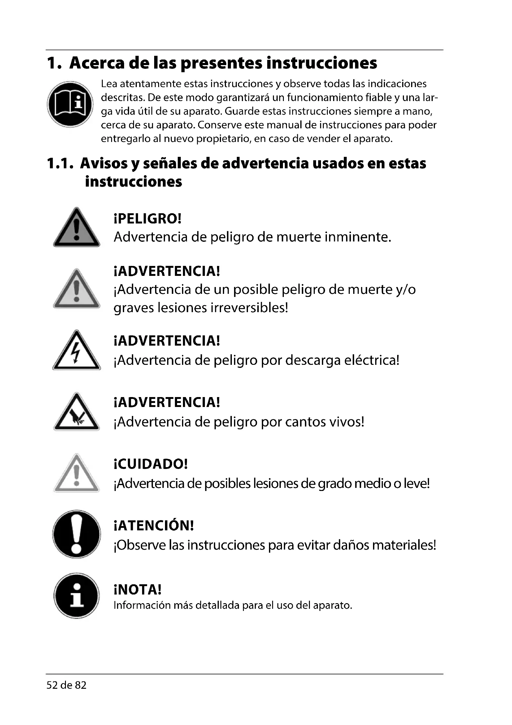 Lea atentamente estas instrucciones y observe todas las indicaciones descritas. De este modo garantizará un funcionamiento fiable y una lar- ga vida útil de su aparato. Guarde estas instrucciones siempre a mano, cerca de su aparato. Conserve este manual de instrucciones para poder entregarlo al nuevo propietario, en caso de vender el aparato. 1.1. Avisos y señales de advertencia usados en estas instrucciones ¡PELIGRO! Advertencia de peligro de muerte inminente. ¡ADVERTENCIA! ¡Advertencia de un posible peligro de muerte y/o graves lesiones irreversibles! ¡ADVERTENCIA! ¡Advertencia de peligro por descarga eléctrica! ¡ADVERTENCIA! ¡Advertencia de peligro por cantos vivos! ¡CUIDADO! ¡Advertencia de posibles lesiones de grado medio o leve! ¡ATENCIÓN! ¡Observe las instrucciones para evitar daños materiales! ¡NOTA! Información más detallada para el uso del aparato.DE