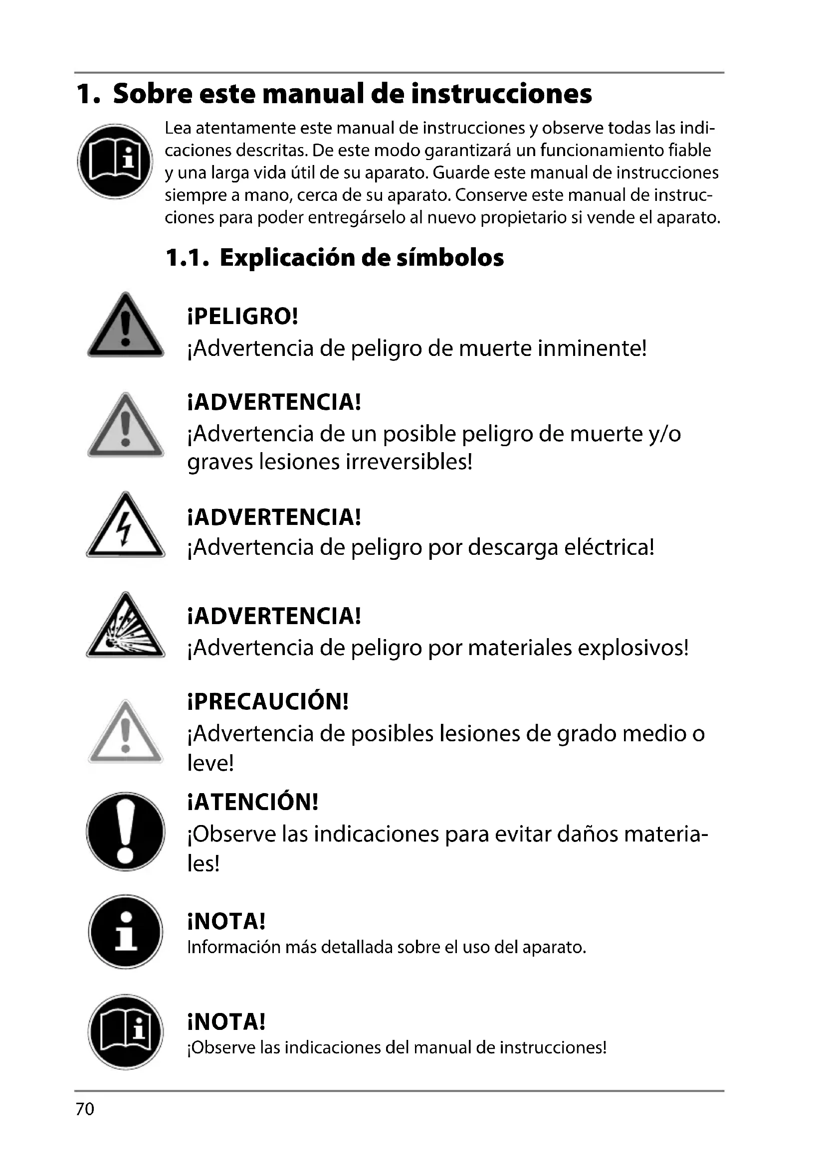 Lea atentamente este manual de instrucciones y observe todas las indi- caciones descritas. De este modo garantizará un funcionamiento fiable y una larga vida útil de su aparato. Guarde este manual de instrucciones siempre a mano, cerca de su aparato. Conserve este manual de instruc- ciones para poder entregárselo al nuevo propietario si vende el aparato. 1.1. Explicación de símbolos ¡PELIGRO! ¡Advertencia de peligro de muerte inminente! ¡ADVERTENCIA! ¡Advertencia de un posible peligro de muerte y/o graves lesiones irreversibles! ¡ADVERTENCIA! ¡Advertencia de peligro por descarga eléctrica! ¡ADVERTENCIA! ¡Advertencia de peligro por materiales explosivos! ¡PRECAUCIÓN! ¡Advertencia de posibles lesiones de grado medio o leve! ¡ATENCIÓN! ¡Observe las indicaciones para evitar daños materia- les! ¡NOTA! Información más detallada sobre el uso del aparato. ¡NOTA! ¡Observe las indicaciones del manual de instrucciones!71