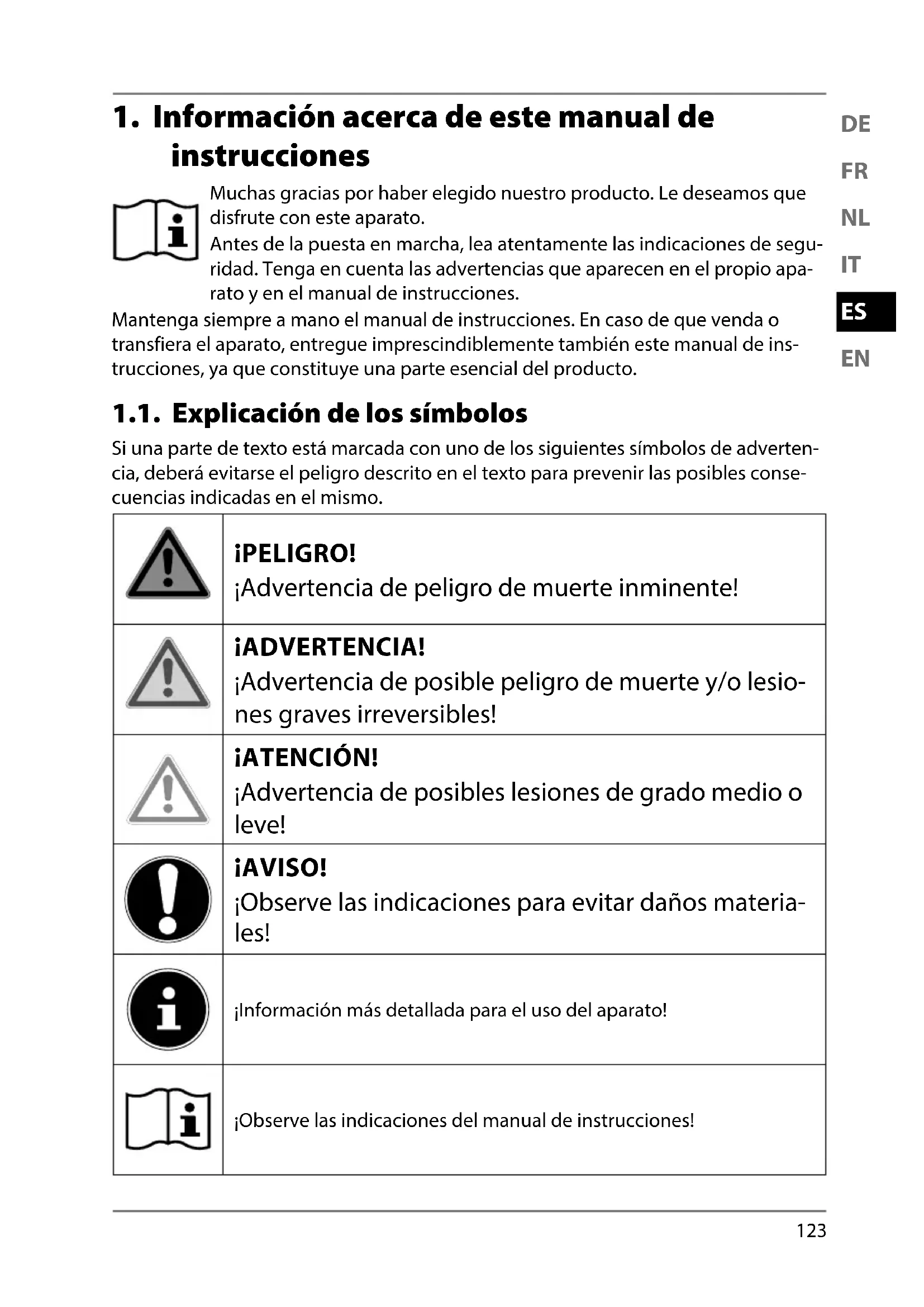 instrucciones Muchas gracias por haber elegido nuestro producto. Le deseamos que disfrute con este aparato. Antes de la puesta en marcha, lea atentamente las indicaciones de segu- ridad. Tenga en cuenta las advertencias que aparecen en el propio apa- rato y en el manual de instrucciones. Mantenga siempre a mano el manual de instrucciones. En caso de que venda o transfiera el aparato, entregue imprescindiblemente también este manual de ins- trucciones, ya que constituye una parte esencial del producto. 1.1. Explicación de los símbolos Si una parte de texto está marcada con uno de los siguientes símbolos de adverten- cia, deberá evitarse el peligro descrito en el texto para prevenir las posibles conse- cuencias indicadas en el mismo. ¡PELIGRO! ¡Advertencia de peligro de muerte inminente! ¡ADVERTENCIA! ¡Advertencia de posible peligro de muerte y/o lesio- nes graves irreversibles! ¡ATENCIÓN! ¡Advertencia de posibles lesiones de grado medio o leve! ¡AVISO! ¡Observe las indicaciones para evitar daños materia- les! ¡Información más detallada para el uso del aparato! ¡Observe las indicaciones del manual de instrucciones!124