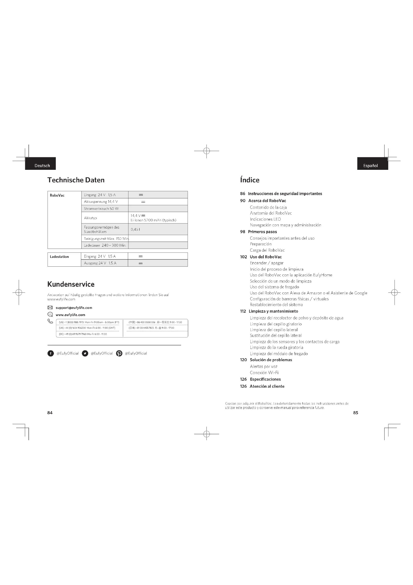 Deutsch Technische Daten RoboVac Eingang 24 V 1,5 A Akkuspannung 14,4 V Stromverbrauch 50 W Akkutyp 14,4 V Li-Ionen 5200 mAh (typisch) Fassungsvermögen des Staubbehälters 0,45 l Reinigungszeit Max. 150 Min. Ladedauer 240 – 300 Min. Ladestation Eingang 24 V 1,5 A Ausgang 24 V 1,5 A Kundenservice Antworten auf häufig gestellte Fragen und weitere Informationen finden Sie auf www.eufylife.com support@eufylife.com www.eufylife.com Gracias por adquirir el RoboVac. Lea detenidamente todas las instrucciones antes de utilizar este producto y conserve este manual para referencia futura. Índice 86 Instrucciones de seguridad importantes 90 Acerca del RoboVac Contenido de la caja Anatomía del RoboVac Indicaciones LED Navegación con mapa y administración 98 Primeros pasos Consejos importantes antes del uso Preparación Carga del RoboVac 102 Uso del RoboVac Encender / apagar Inicio del proceso de limpieza Uso del RoboVac con la aplicación EufyHome Selección de un modo de limpieza Uso del sistema de fregado Uso del RoboVac con Alexa de Amazon o el Asistente de Google Configuración de barreras físicas / virtuales Restablecimiento del sistema 112 Limpieza y mantenimiento Limpieza del recolector de polvo y depósito de agua Limpieza del cepillo giratorio Limpieza del cepillo lateral Sustitución del cepillo lateral Limpieza de los sensores y los contactos de carga Limpieza de la rueda giratoria Limpieza del módulo de fregado 120 Solución de problemas Alertas por voz Conexión Wi-Fi 126 Especificaciones 126 Atención al cliente8786 Español Español Instrucciones de seguridad importantes A fin de reducir el riesgo de lesiones o daños, lea detenidamente estas instrucciones de seguridad y consérvelas a mano durante la configuración, el uso y el mantenimiento de este dispositivo.