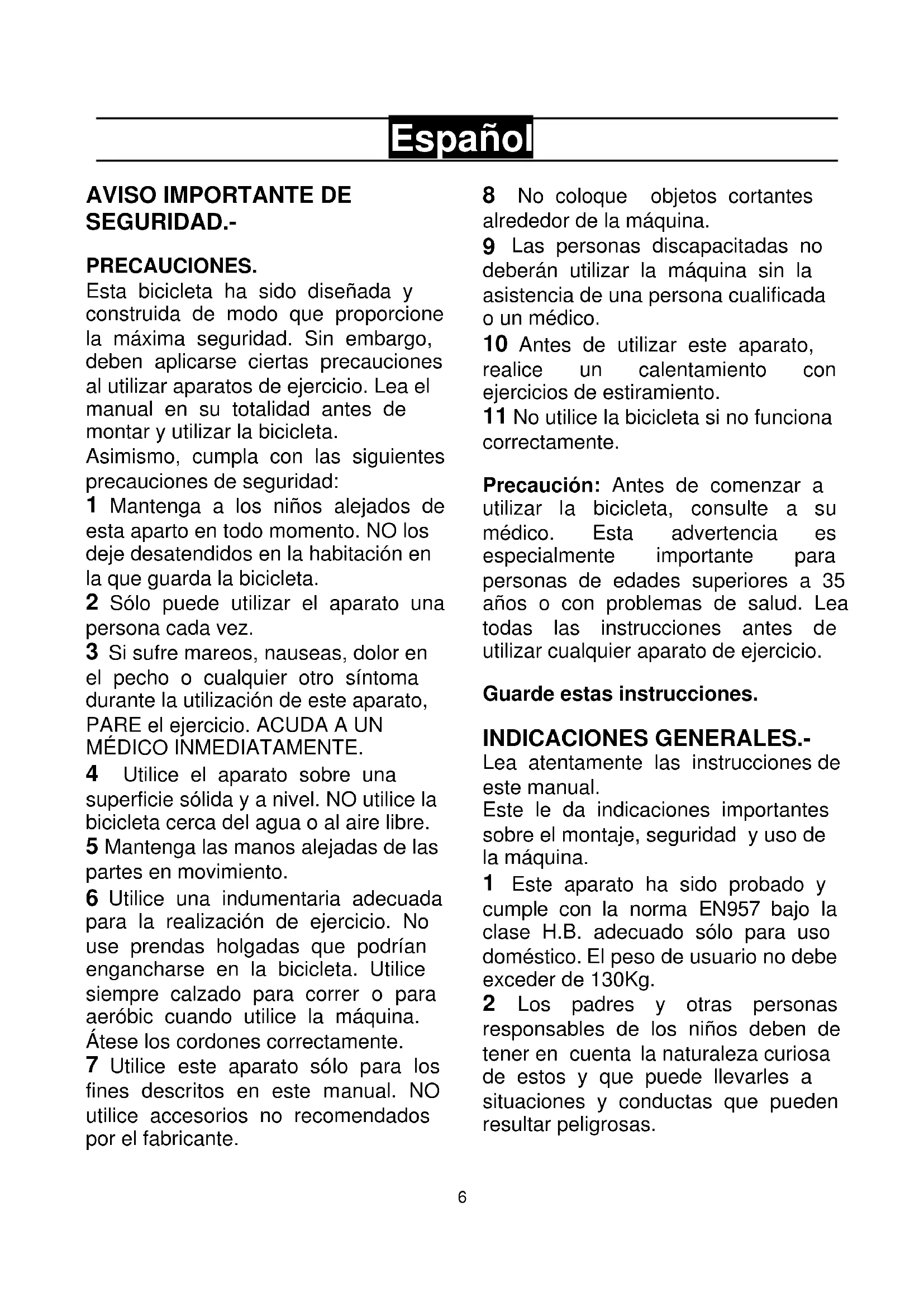 No utilice la bicicleta si no funciona correctamente. Precaución: Antes de comenzar a utilizar la bicicleta, consulte a su médico. Esta advertencia es especialmente importante para personas de edades superiores a 35 años o con problemas de salud. Lea todas las instrucciones antes de utilizar cualquier aparato de ejercicio. Guarde estas instrucciones. INDICACIONES GENERALES.- Lea atentamente las instrucciones de este manual. Este le da indicaciones importantes sobre el montaje, seguridad y uso de la máquina.