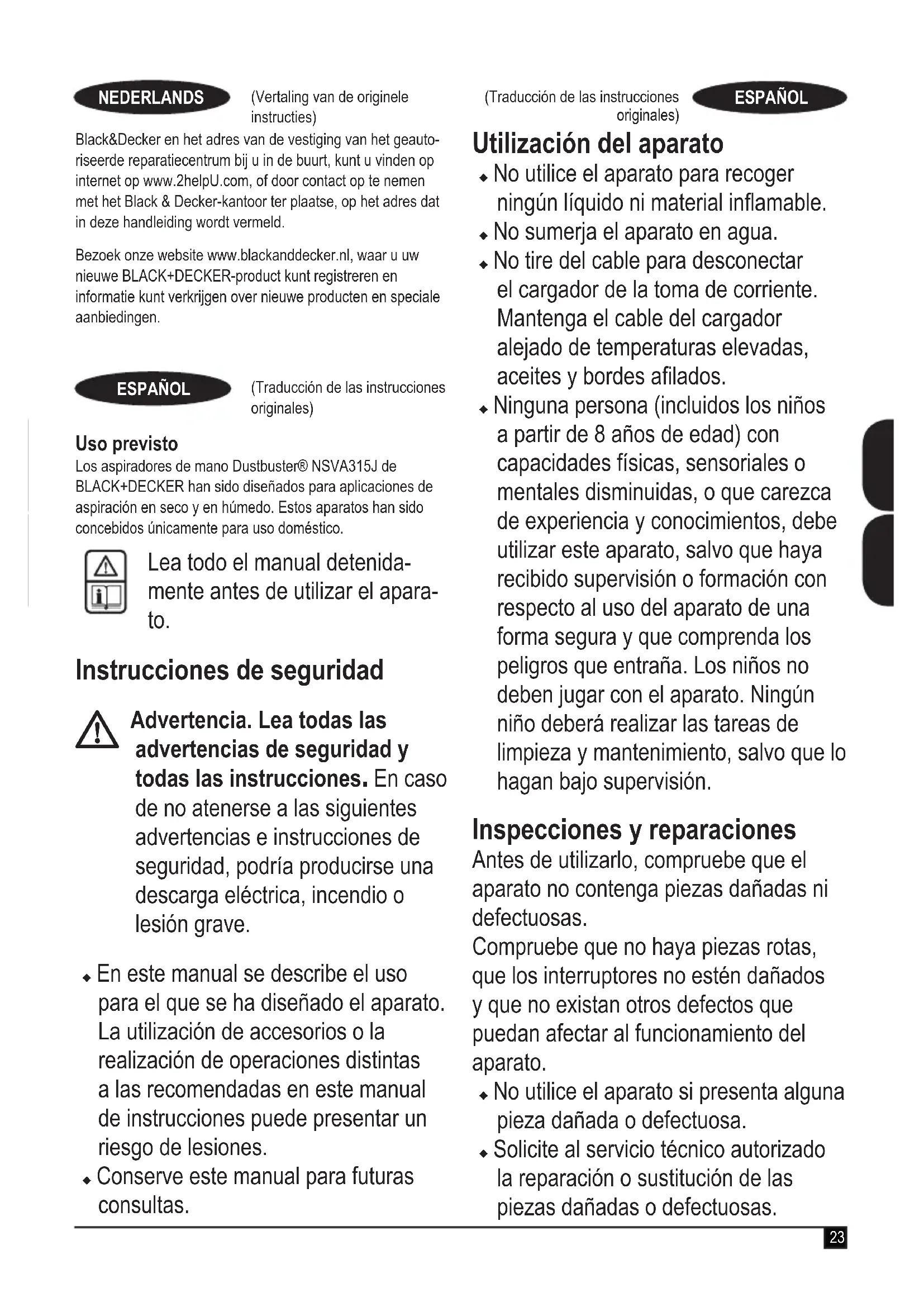 Garantía Black & Decker confía en la calidad de sus productos y ofrece a los consumidores una garantía de 24 meses a partir de la fecha de compra. Esta garantía es adicional a sus derechos legales y no los menoscaba en modo alguno. La garantía es válida dentro de los territorios de los Estados Miembros de la Unión Europea y del Área de Libre Comercio Europea. Para reclamar la garantía, la reclamación se debe presentar de conformidad con las condiciones de Black & Decker. Tendrá que adjuntar un justicante de compra al vendedor o al agente técnico autorizado. Las condiciones de la garantía de 2 años de Black & Decker y la ubicación de su agente téc-nico autorizado más cercano se pueden obtener en Internet en www.2helpU.com o poniéndose en contacto con su ocina local de Black & Decker en la dirección que se indica en este manual. Visite nuestro sitio web www.blackanddecker.co.uk para reg-istrar su nuevo producto BLACK+DECKER y recibir noticias sobre nuevos productos y ofertas especiales.(Tradução das instruções originais)PORTUGUÊS Utilização prevista Os aspiradores portáteis BLACK+DECKER NSVA315J Dustbuster® foram concebidos para limpeza ligeira a vácuo húmida e seca. Estes aparelhos destinam-se apenas a utilização doméstica Leia com atenção todo o manual antes de utilizar o aparelho. Instruções de segurança