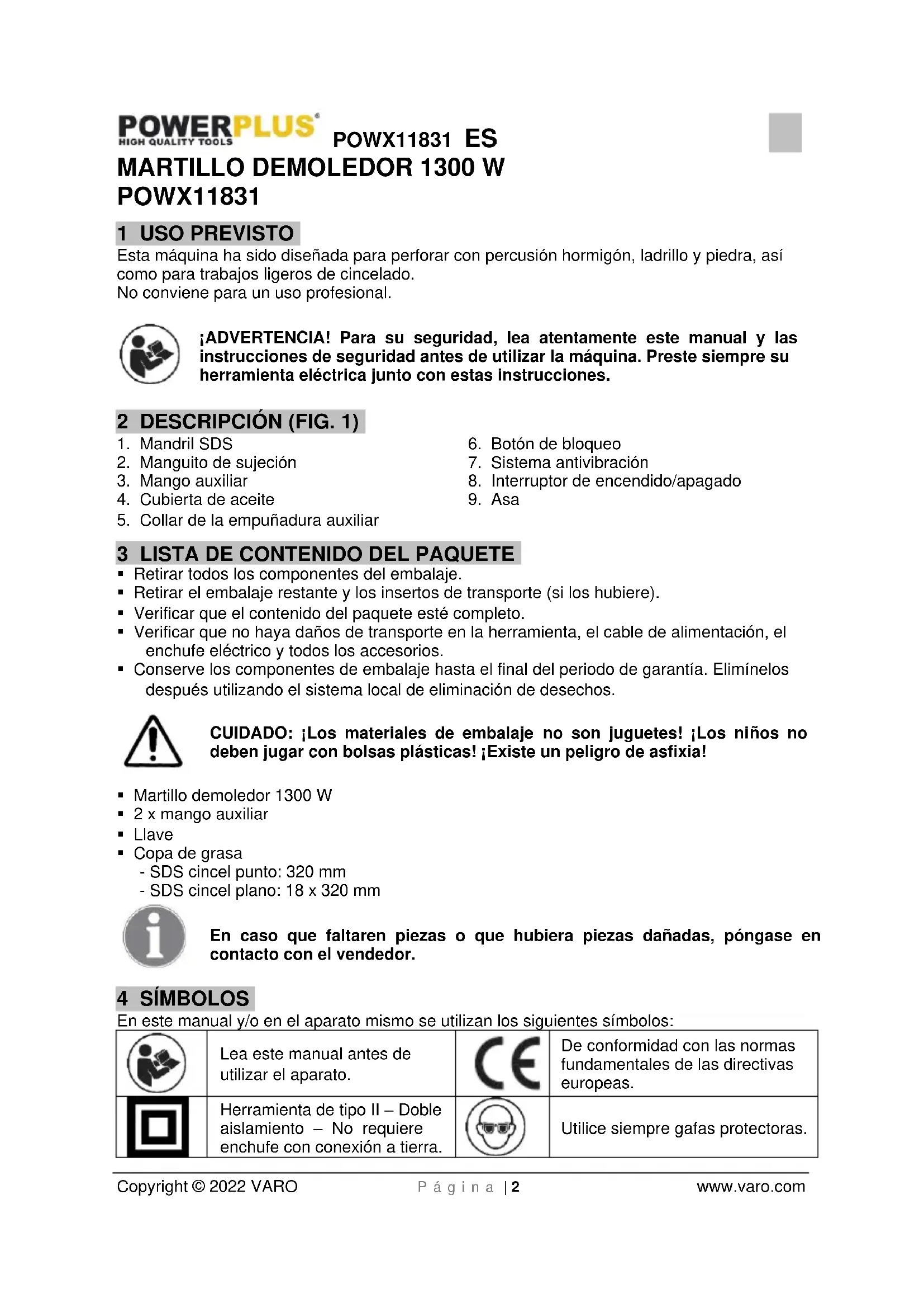 - Esté atento. Concéntrense en el trabajo que esté realizando y utilice las herramientas eléctricas con sensatez. No utilice el aparato cuando esté cansado o bajo los efectos de narcóticos, alcohol o fármacos. Un momento de inatención mientras se utiliza una herramienta eléctrica puede provocar graves lesiones corporales.POWX11831 ES Copyright © 2022 VARO P á g i n a | 4 www.varo.com